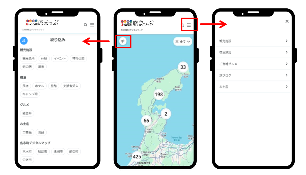 ・地図上の左上にあるアイコンをさわると詳細の絞込みができます。
