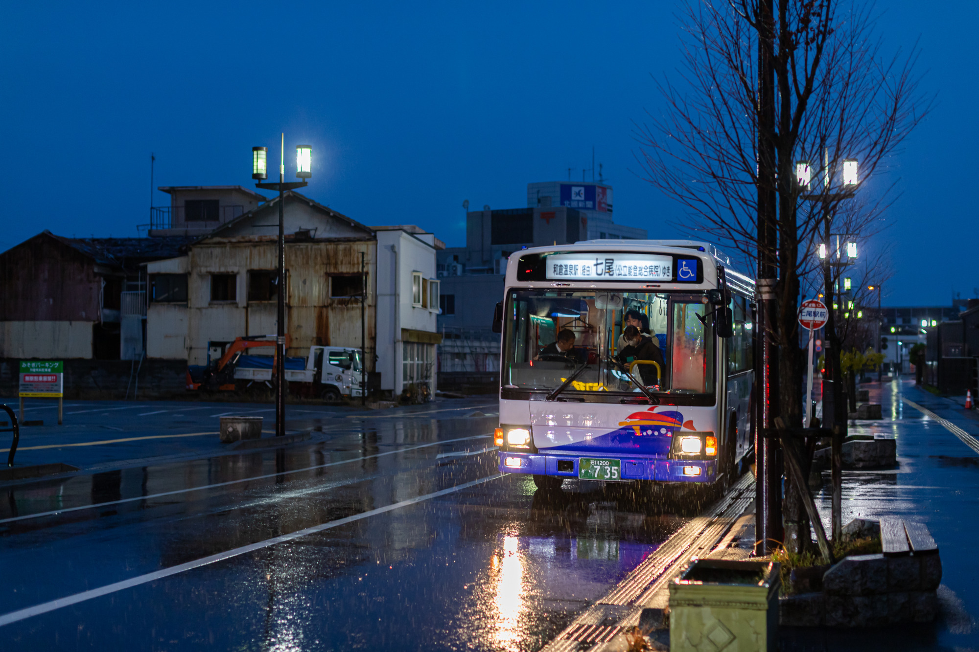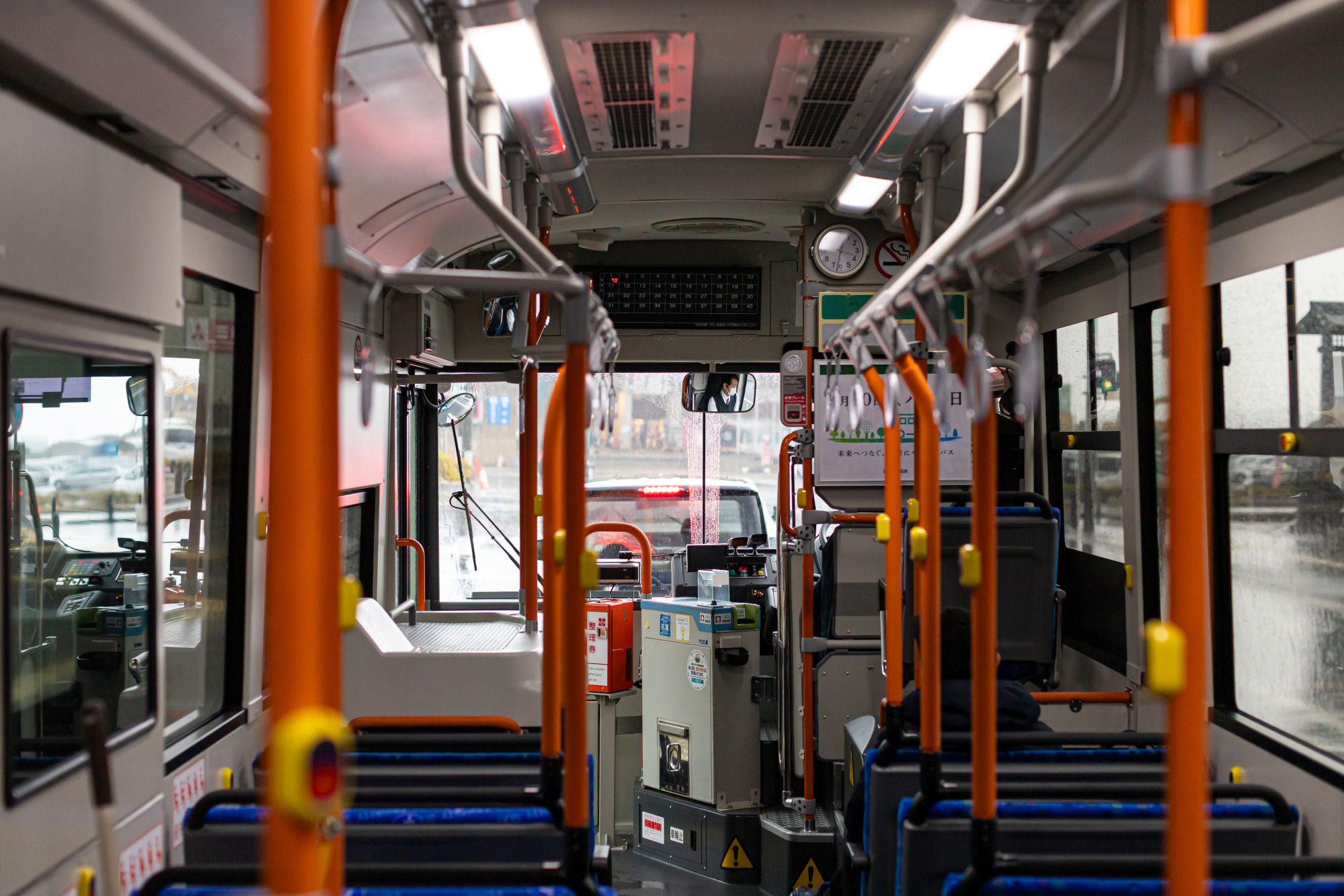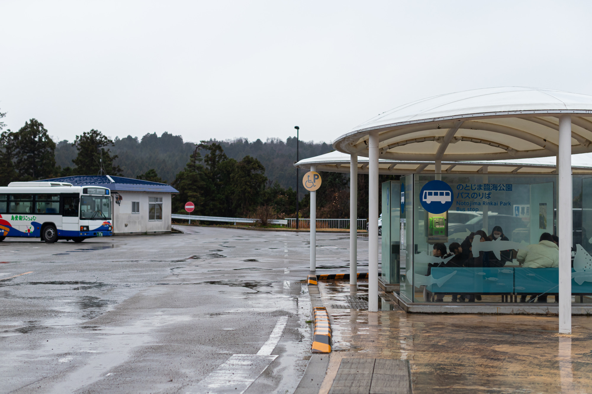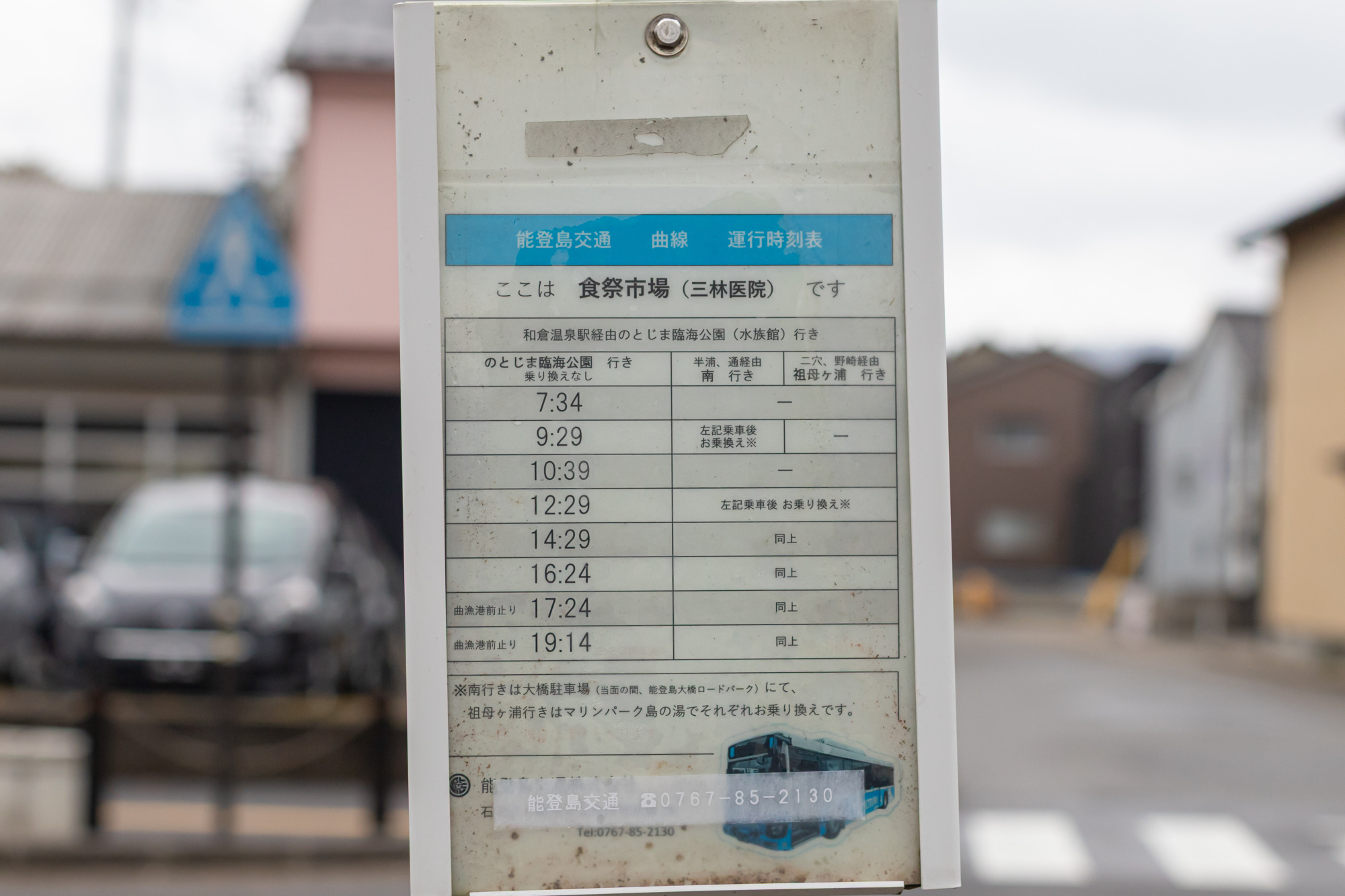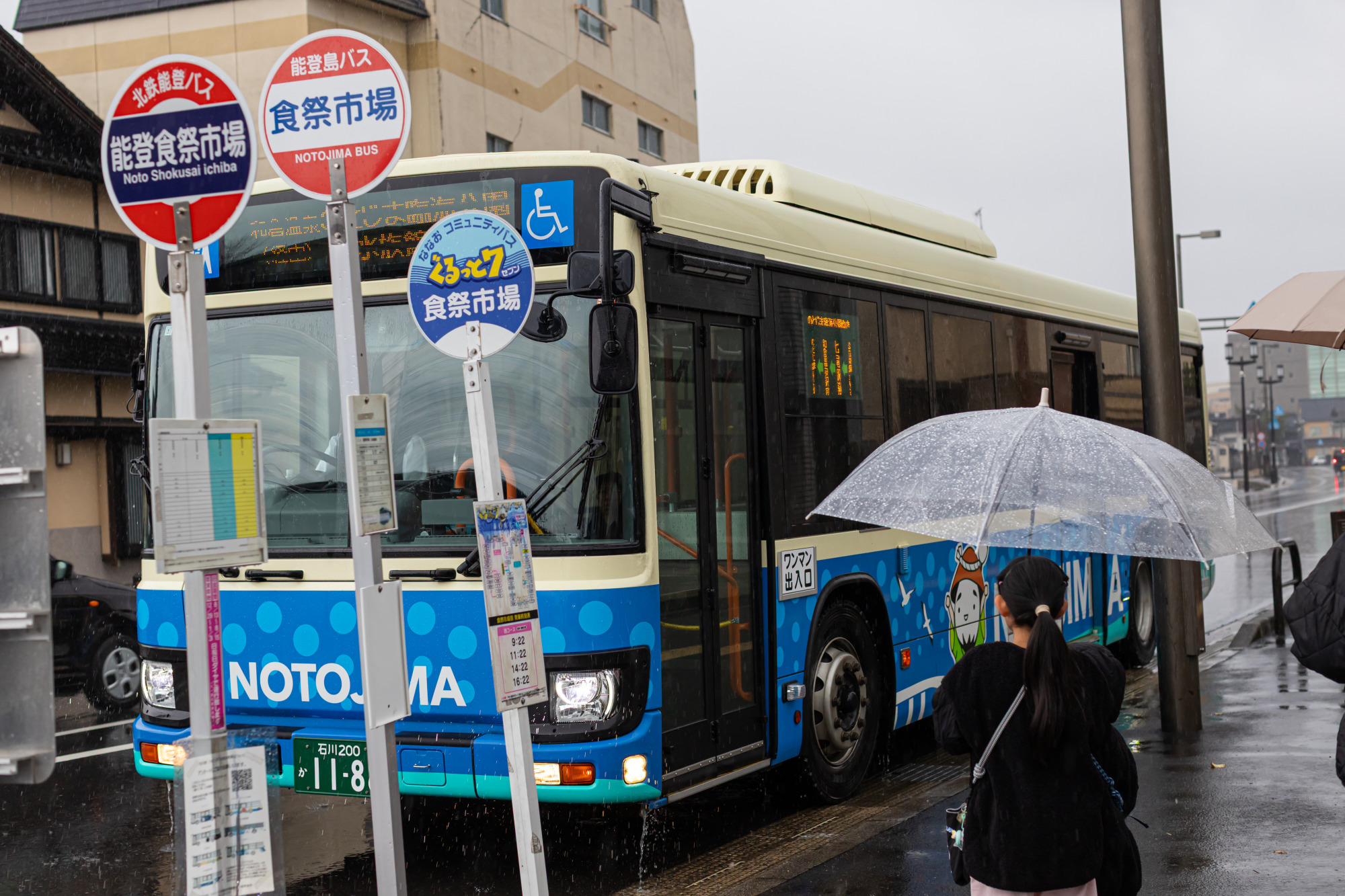 能登食祭市場を出ると、あいにくの雨模様。歩いてすぐの場所にある「三林医院前」バス停から、路線バスに乗車します。