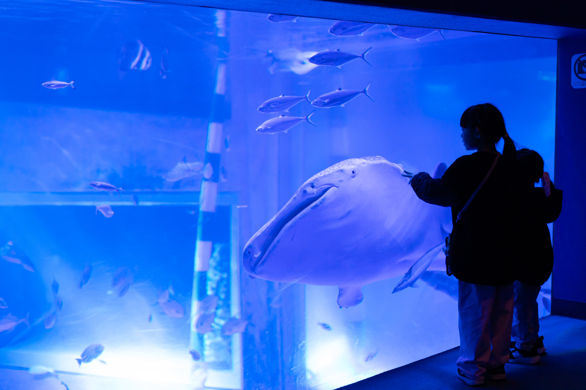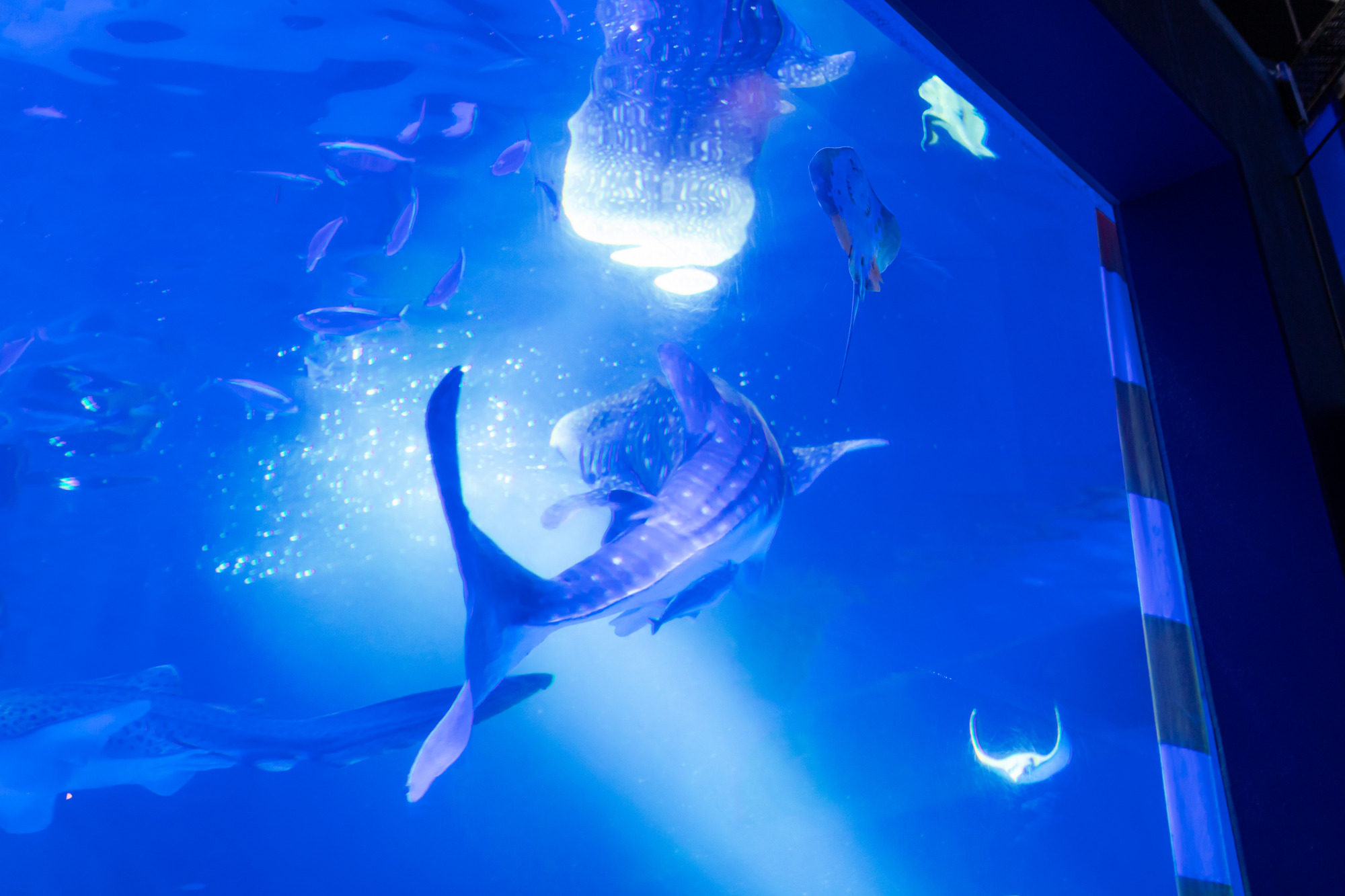 入館して最初に訪れる「ジンベエザメ館 青の世界」では、間近でその巨大なシルエットを体感できます。