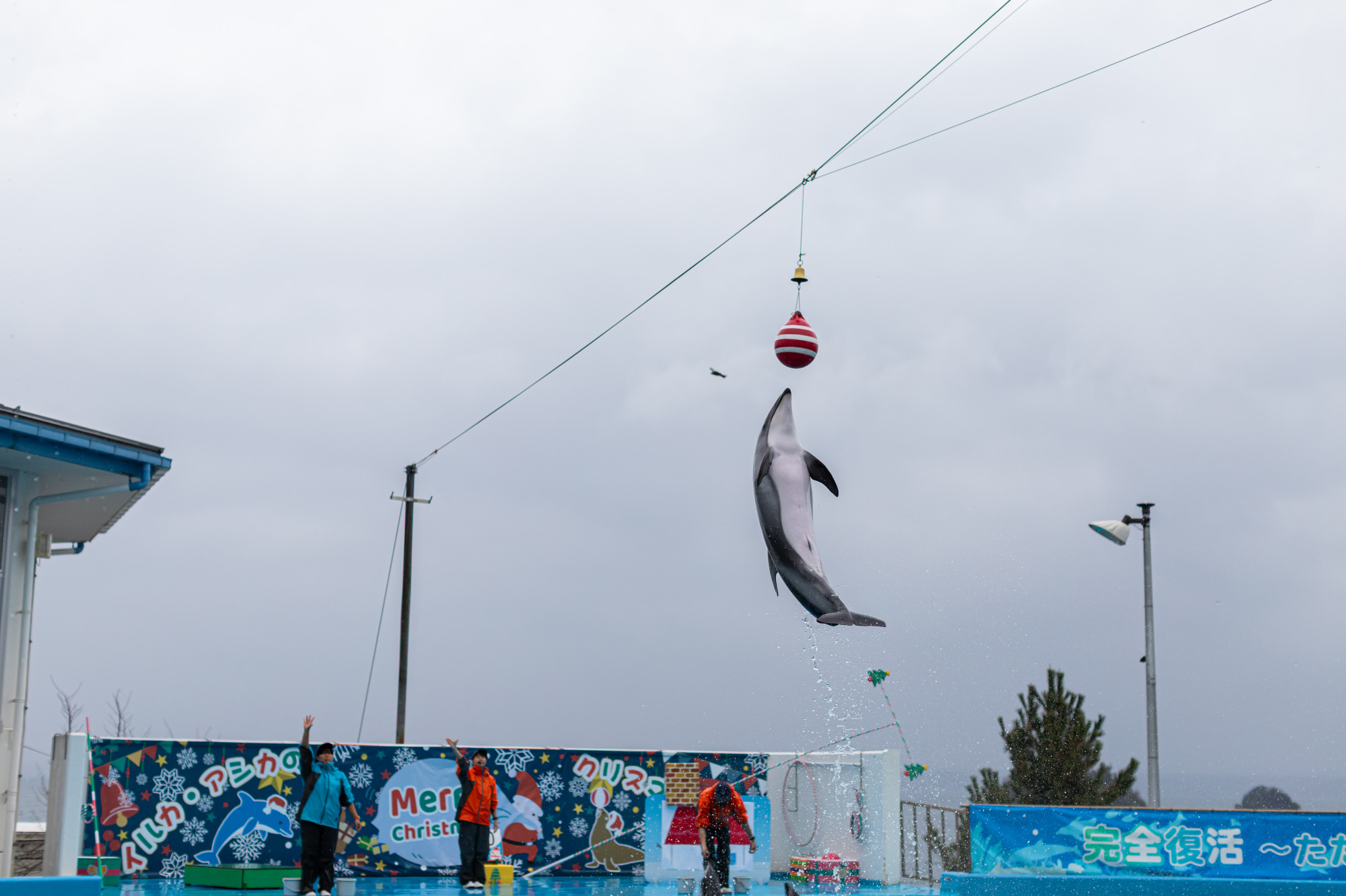 雨の中でもイルカたちは元気いっぱいにジャンプ。目の前で上がる水しぶきの迫力に、子どもだけでなく大人からも歓声が上がります!