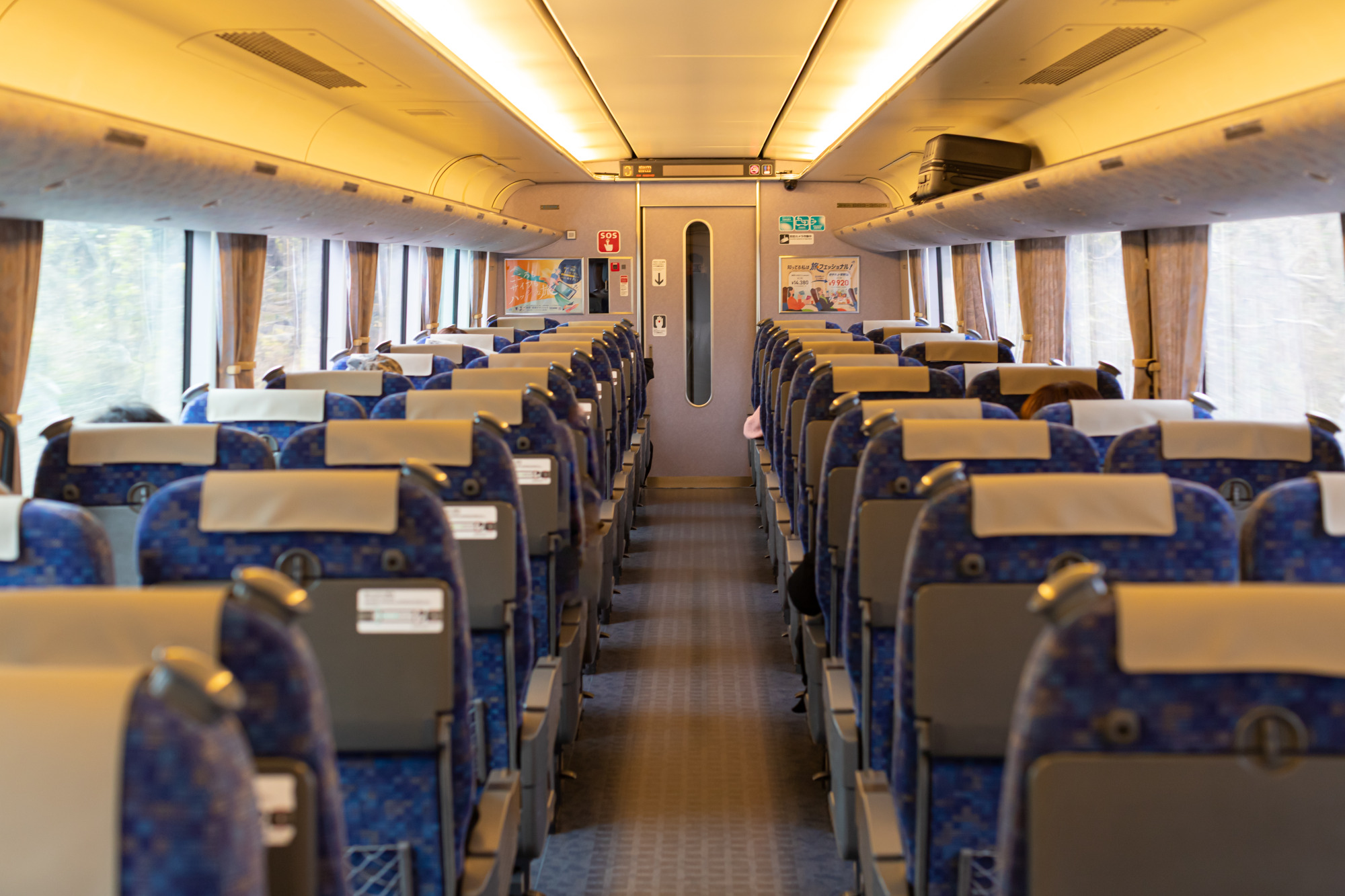 電車の中は座席が広々としていて、とても快適です!シートは回転式のため、家族で向かい合わせに座ることもできます。
