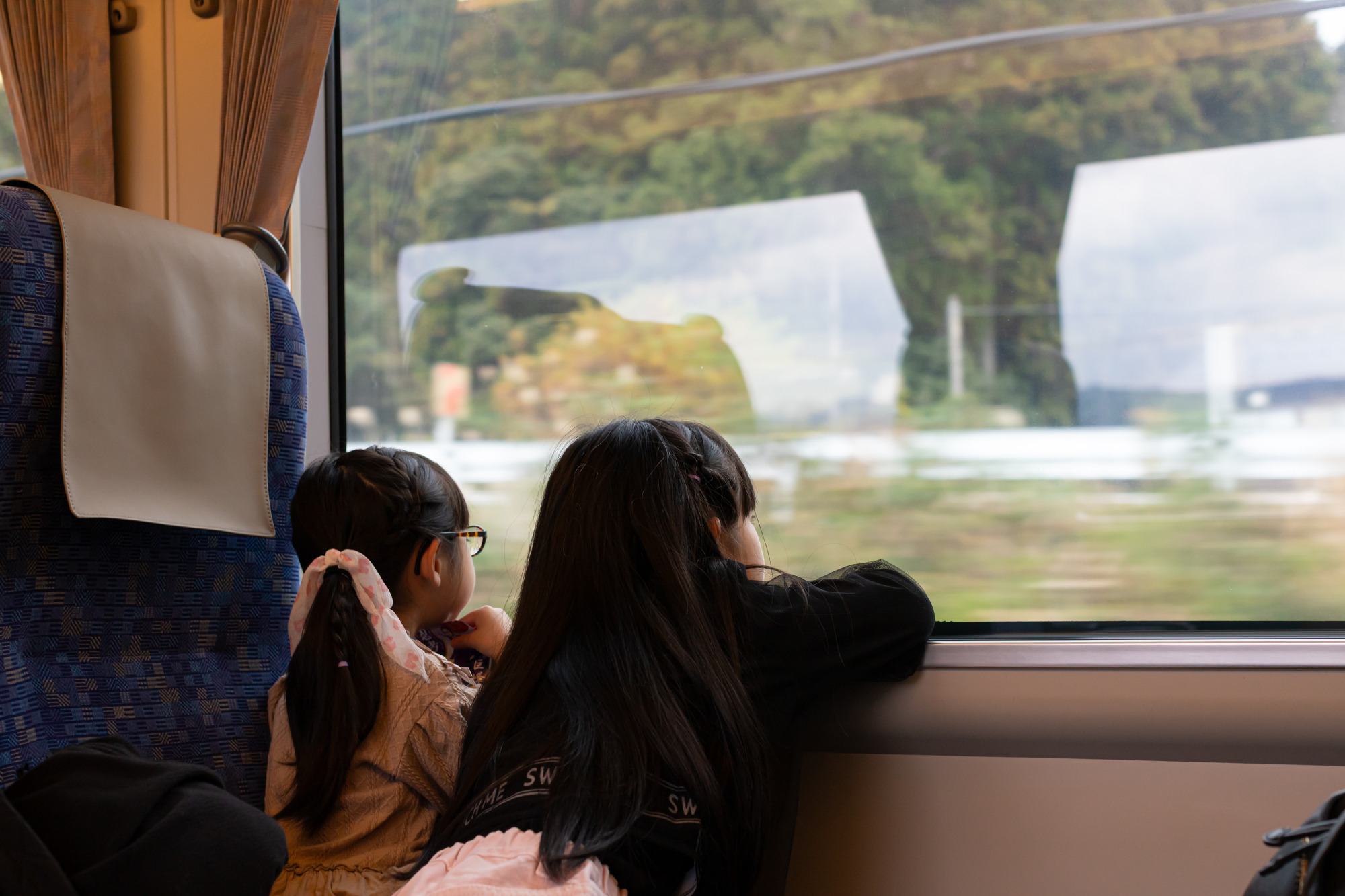 子どもは窓際の席に座り、流れる景色を眺めながらおしゃべりを楽しんでいました。移動時間も、家族みんなでゆったりと過ごせるのが公共交通機関ならではの魅力です♫