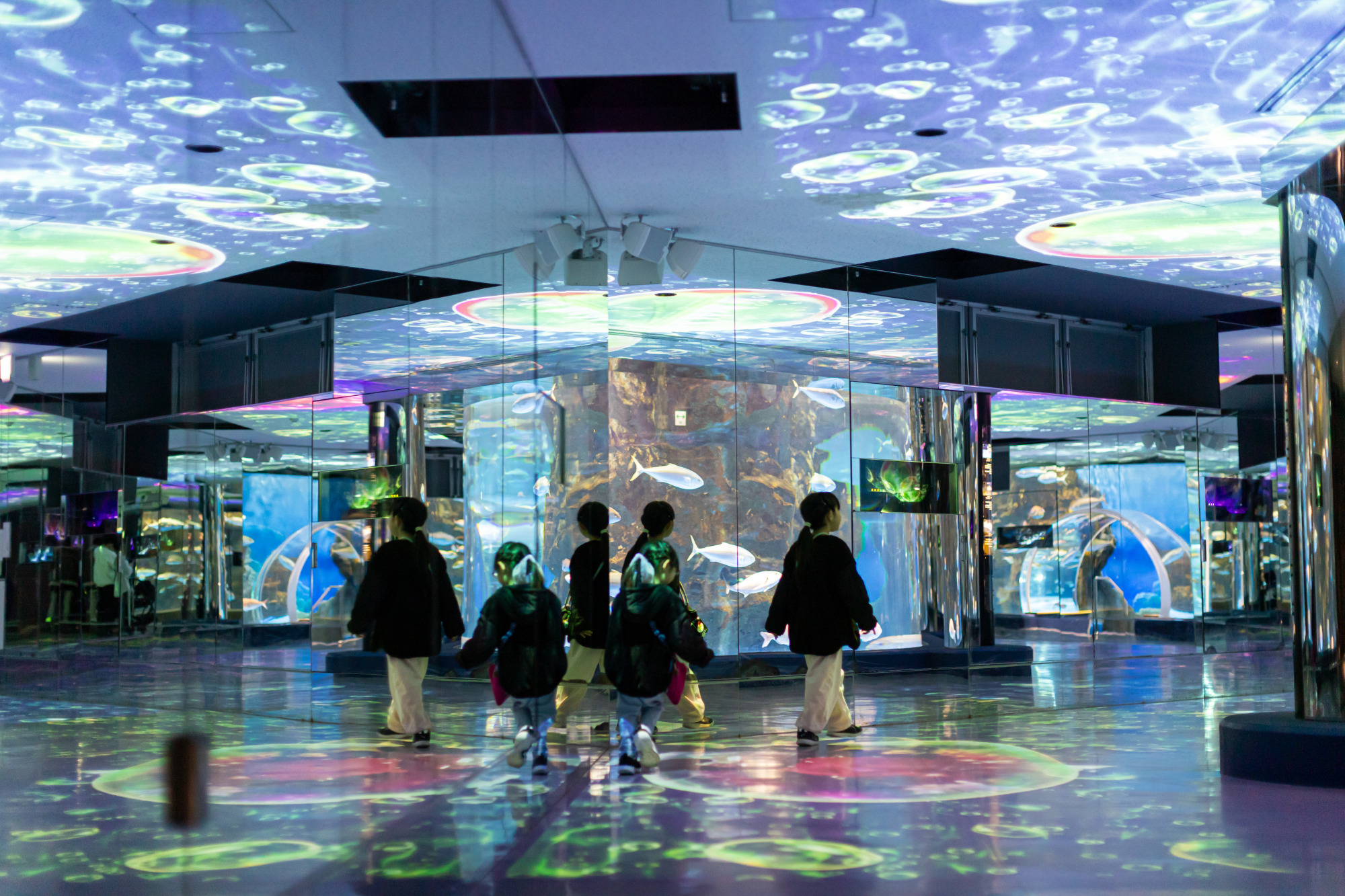 足元を泳いでいく魚の映像に、子どもたちは大興奮。思わず立ち止まって見入ってしまうエリアです。