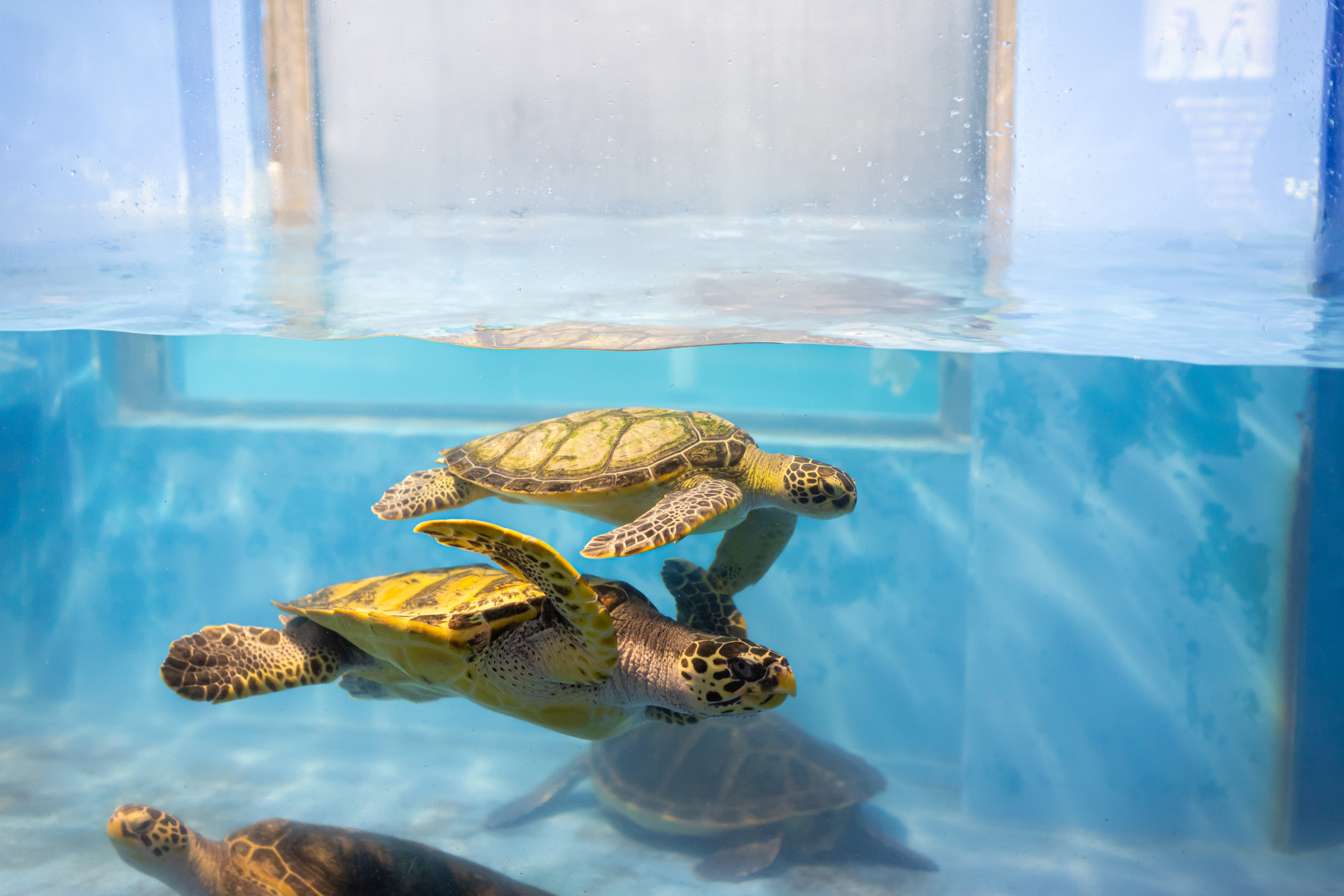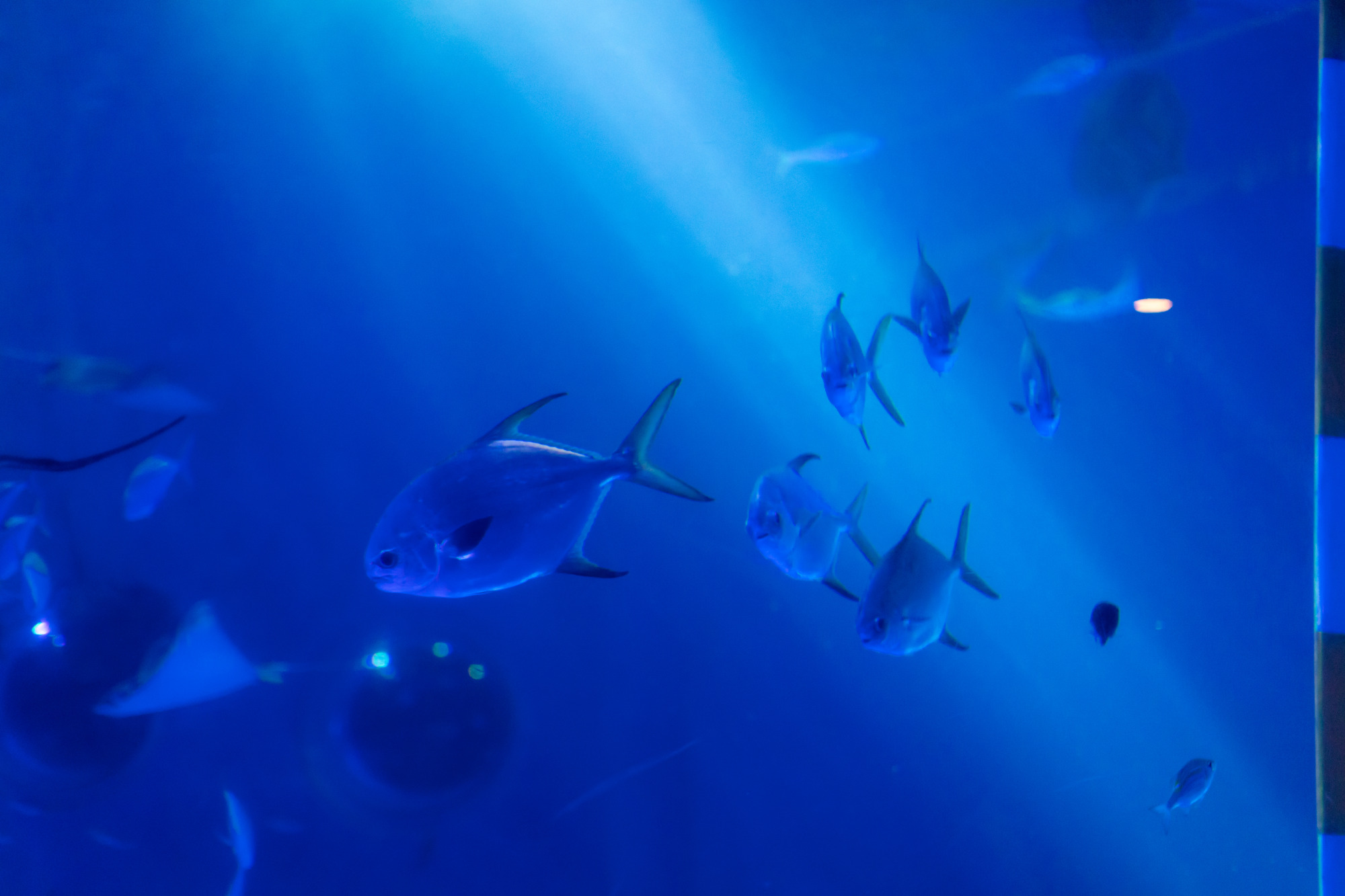 水槽に差し込む光は、見る位置や角度によって表情を変え、場所によってはまるで海底にいるかのような幻想的な空間に包まれます。