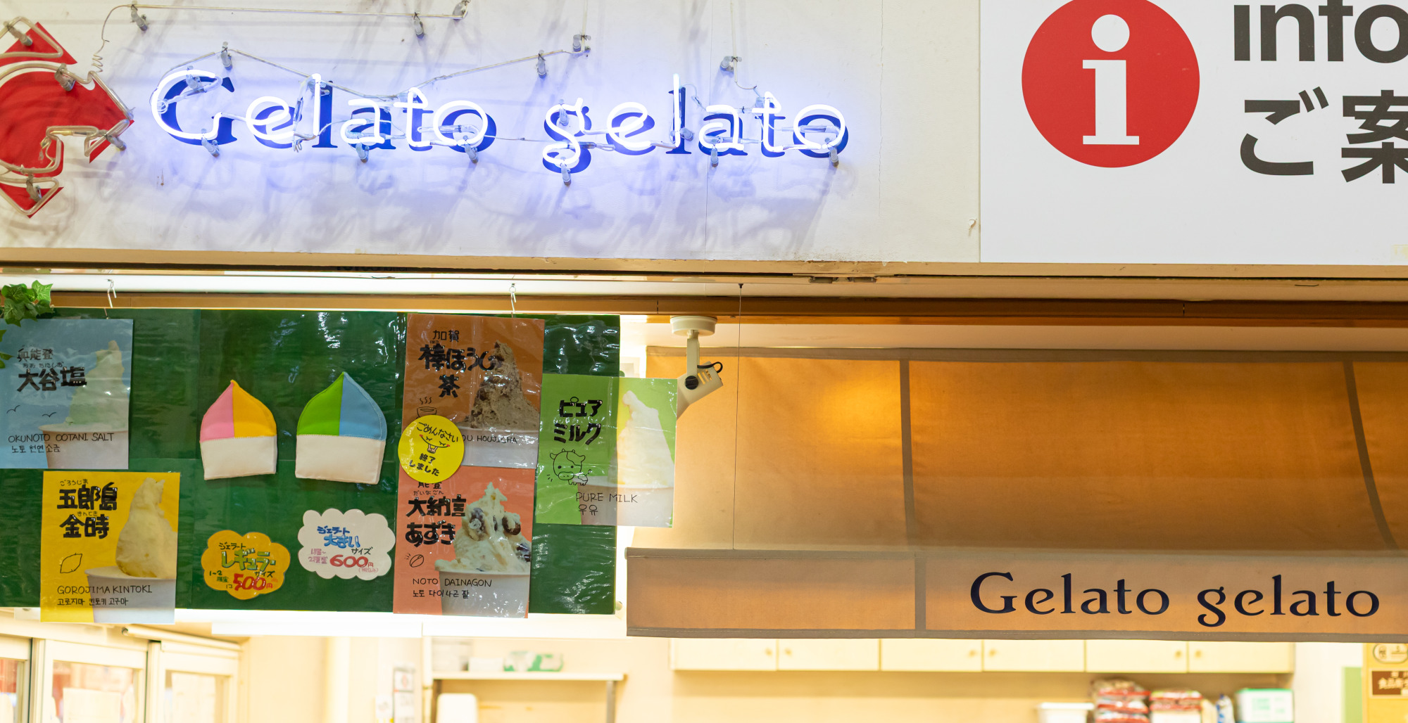 インフォメーション横にあるイタリアンジェラートのお店(Gelato gelato)に、ちょっと寄り道。色とりどりのフレーバーが並び、どれにしようか思わず迷ってしまいます。