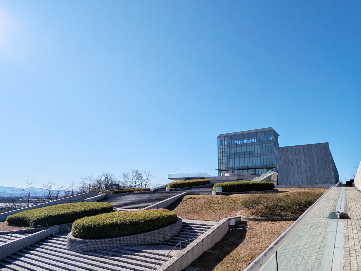 駐車場から見上げる丘の上に、凛として佇むコンクリートの造形。階段を上る間、広大なかほくの景色を想像しながら、振り返りたい衝動をグッとがまんします。