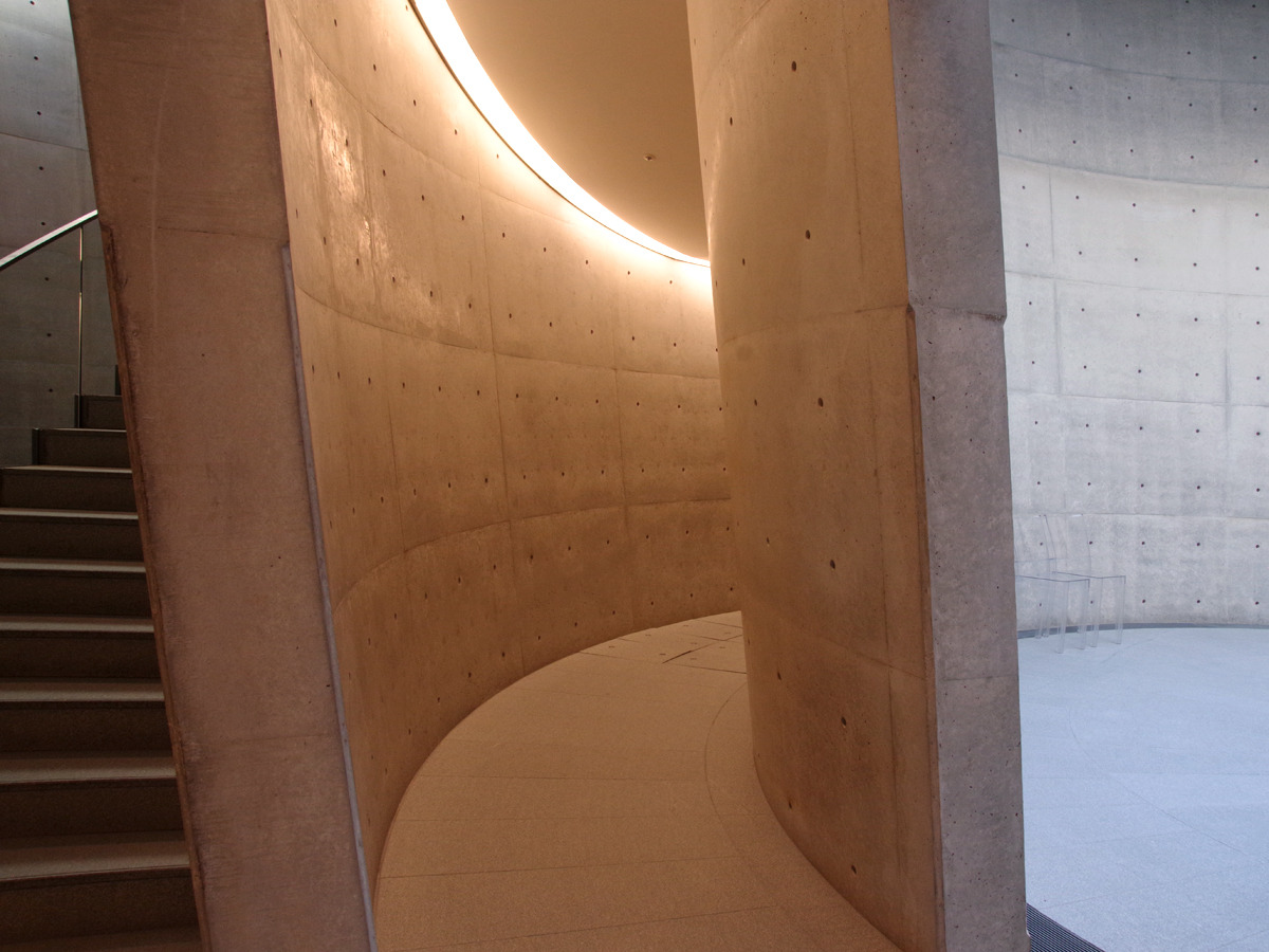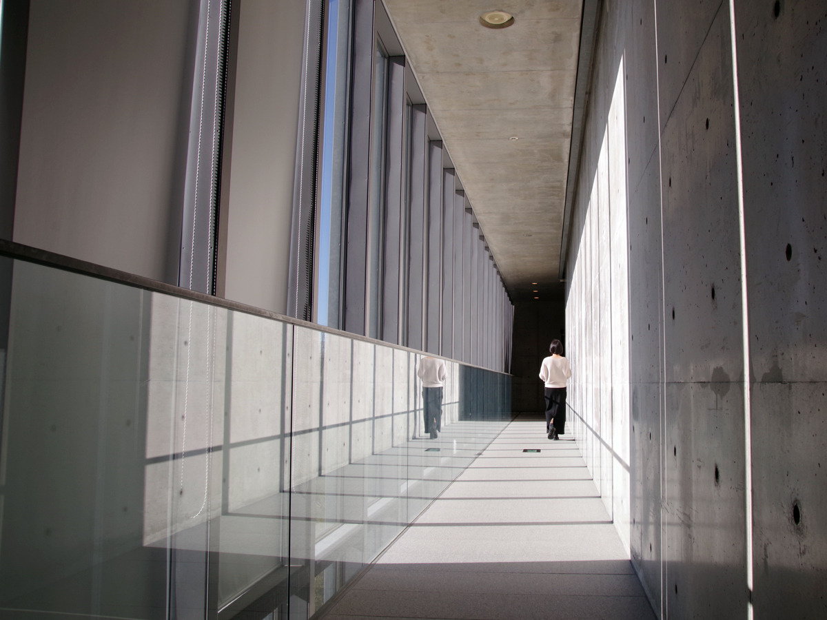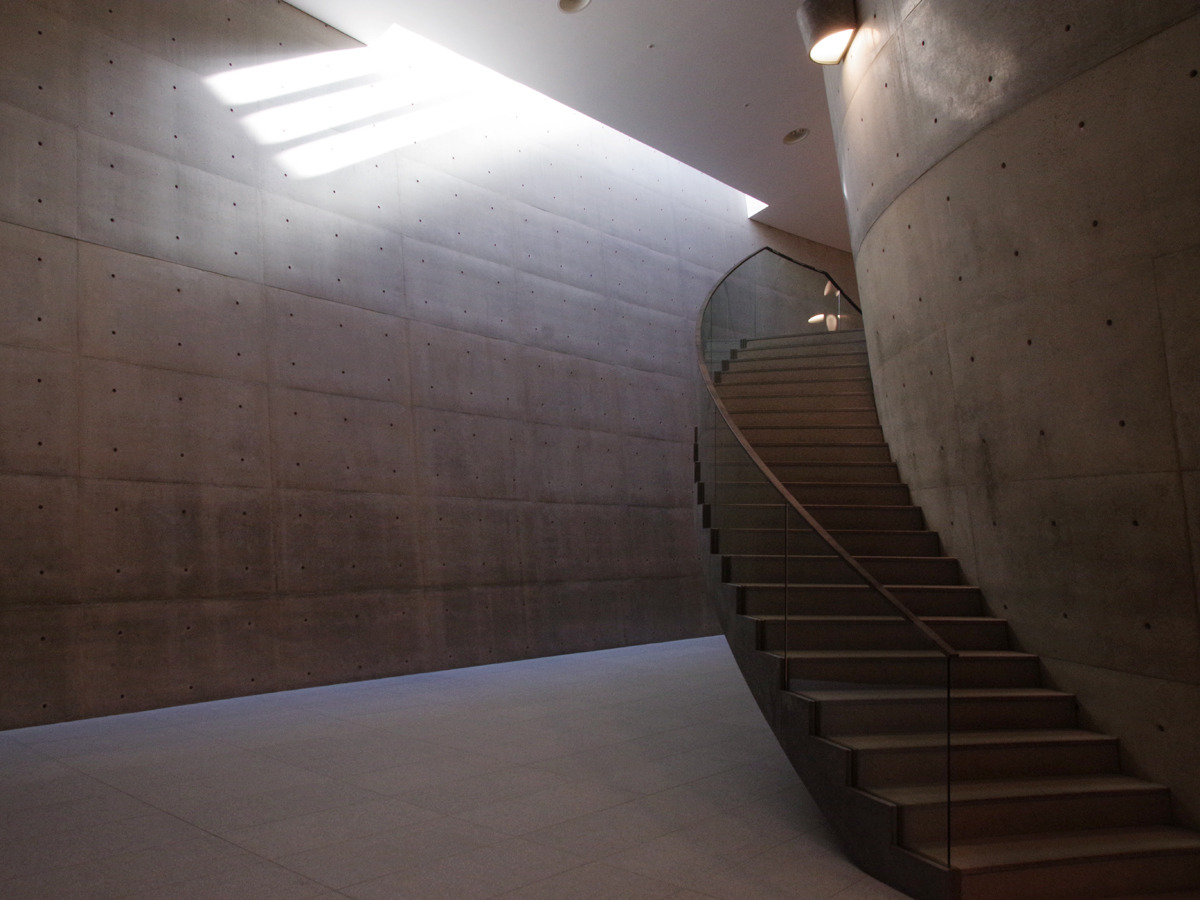 清々しい空気の中で深呼吸をしたあと、館内に一歩踏み入れると、そこはもう安藤建築の世界。打ち放しコンクリートの無彩色に差し込む柔らかな光が、やさしく迎えてくれます。