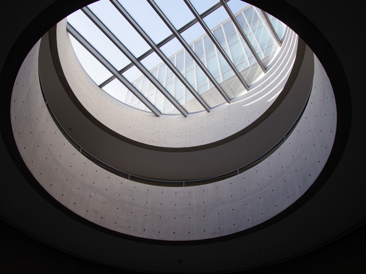 地下から1階までを貫くすり鉢状の空間「ホワイエ」には、天井から柔らかな光が筋状に差し込みます。底に立って見上げると、まるで空から収束する自分の存在を感じることができます。しばらく空を仰いでいると、「収束しているのか、いや自分が発散し空につながっているのか…」と、空間の中にいる自分を強く感じ、まさに「思索と対話」にふさわしい空間であることを実感できます。