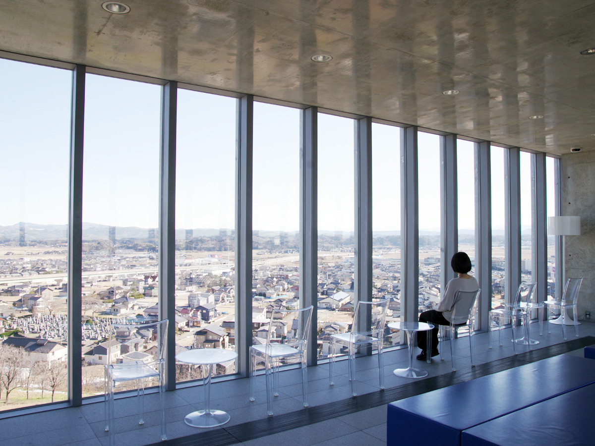 研修棟の5階には、ガラス張りの「展望ラウンジ」があります。エレベーターで上がり、扉が開くと、そこは絶景の癒し空間。