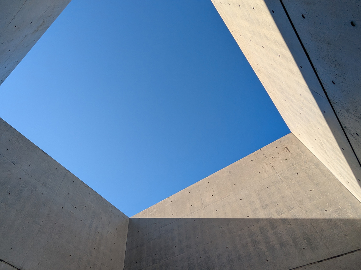 屋外に通じるドアから短い通路を抜けると、そこにあるのは何もない石畳の空間です。立ち止まり、頭上を仰ぐと、そこには切り取られた四角の空。この日は雲ひとつない晴天で、少しひんやりとした清々しい空気を感じられましたが、訪れるたびに違う色や表情に出会えそうです。どこまでも高く遠い空を眺め、しばし瞑想のひとときを過ごしてみてください。