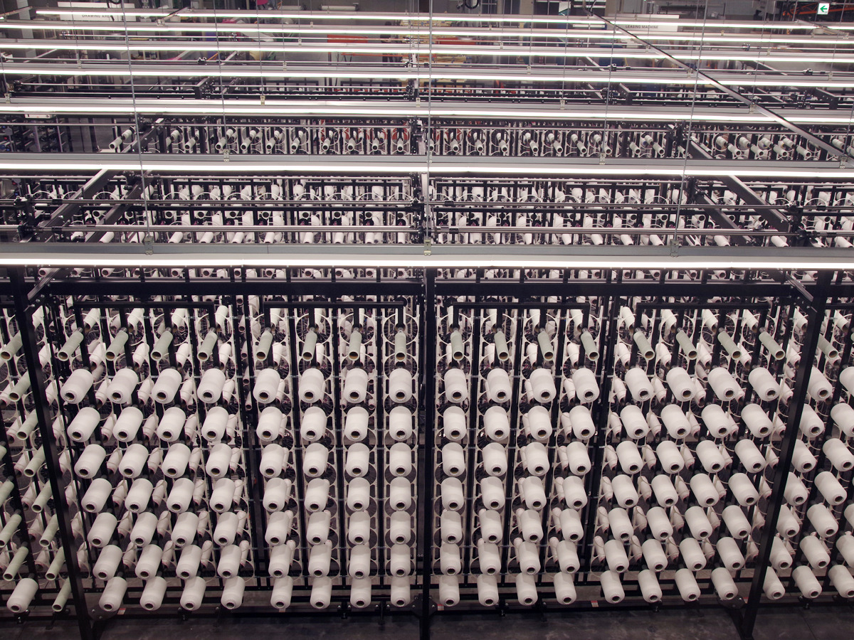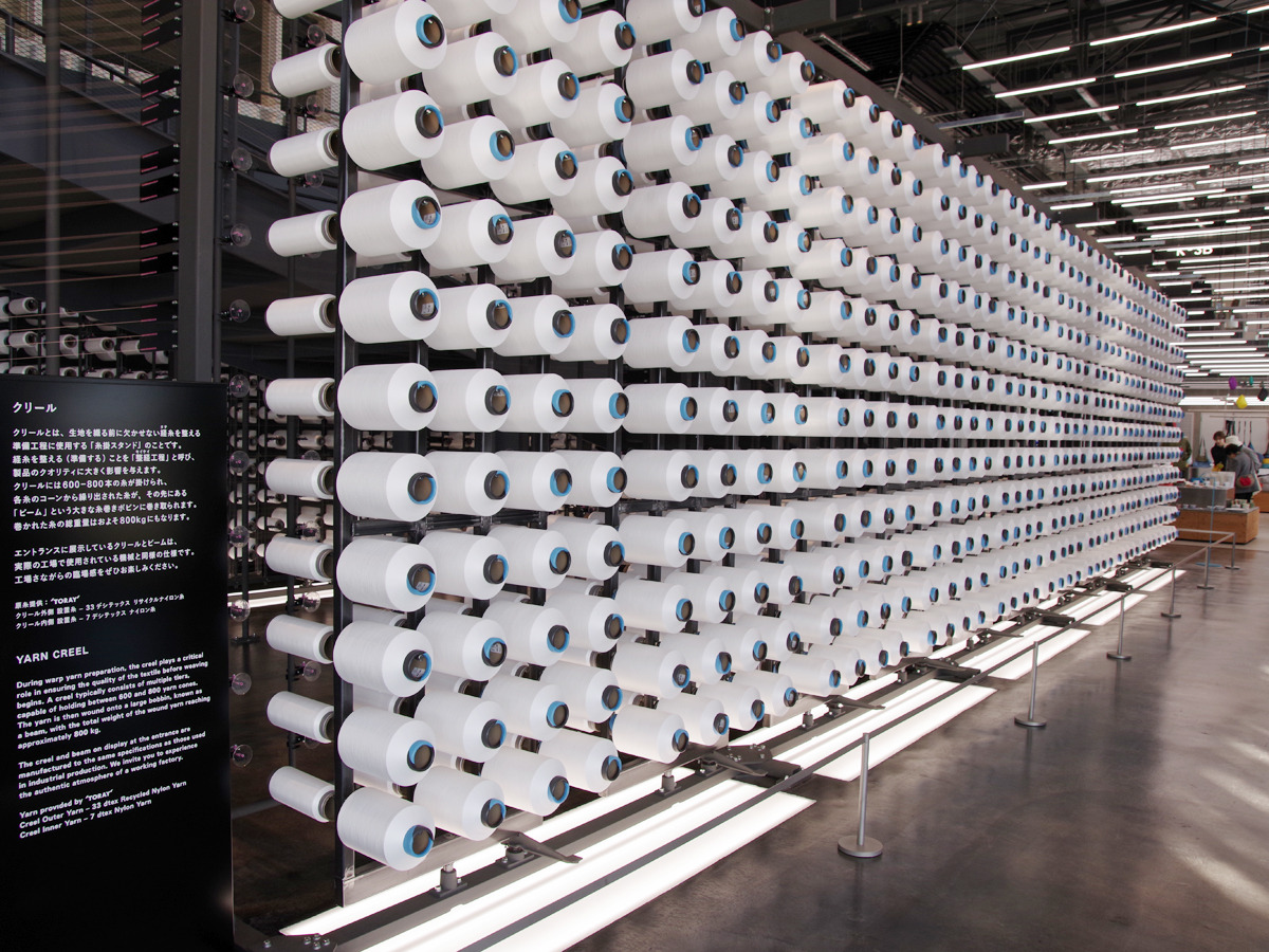 中に入ると、目の前に現れる「クリール(糸掛けスタンド)」と「ビーム(糸を巻いた部材)」。工場内にあるものと同じ仕様で、その数と迫力に圧倒されます。同時に、2階まで吹き抜けた大空間が、心を開放してくれます。左手のカフェレストランに目をやりつつ、クリールの壁に沿って右奥へ進みます。