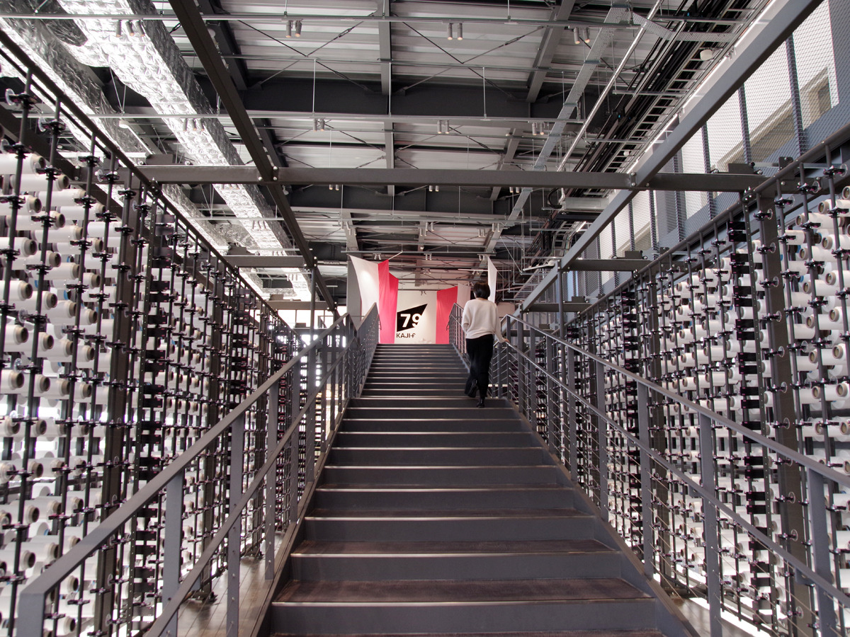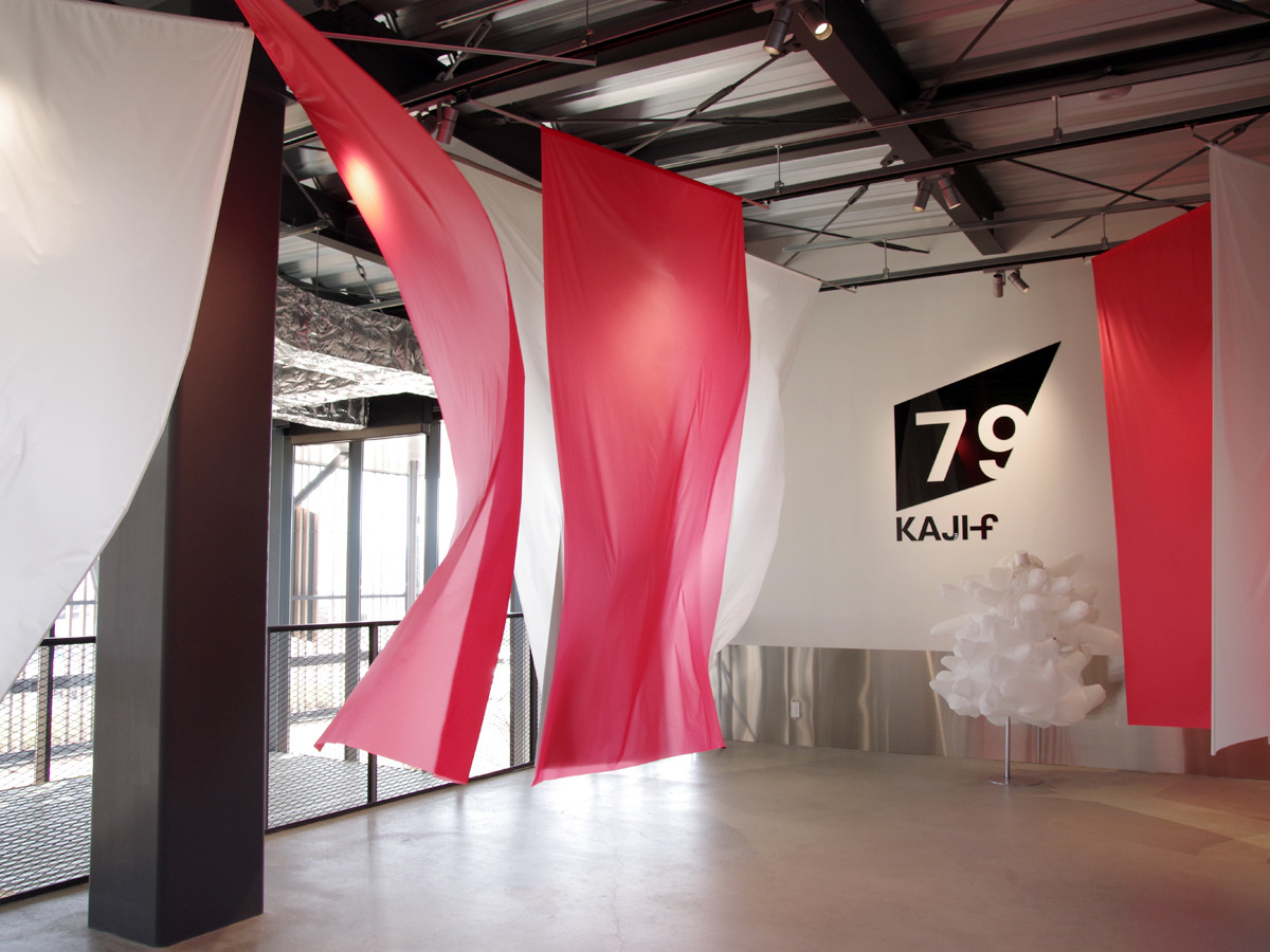 奥へ進むと、緩やかな階段が現れます。クリールに囲まれた階段を上り切ると、風で優雅に舞い上がり、ゆったりとたなびく美しい布のモチーフが展示されています。「79」は金の原子番号で、希少性や高い価値になぞらえた数字。合成繊維で新たな価値を生み出し、その価値をさらに高めていくカジグループの挑戦を表しているそうです。