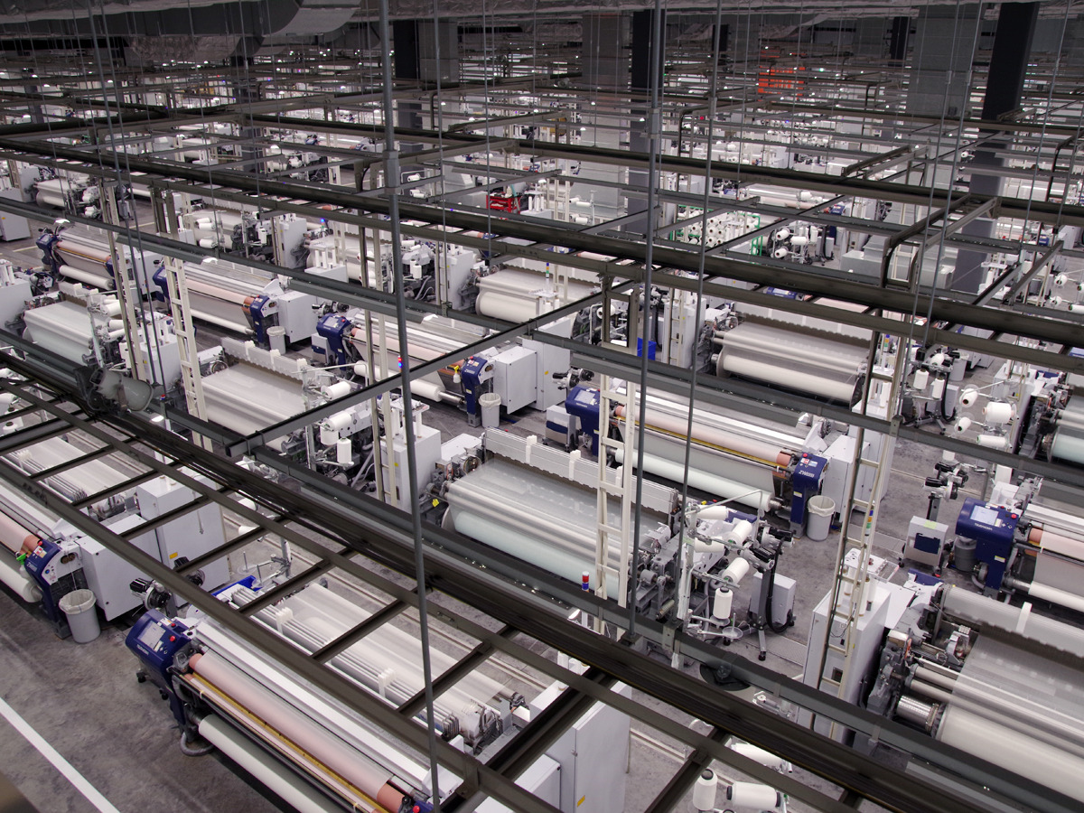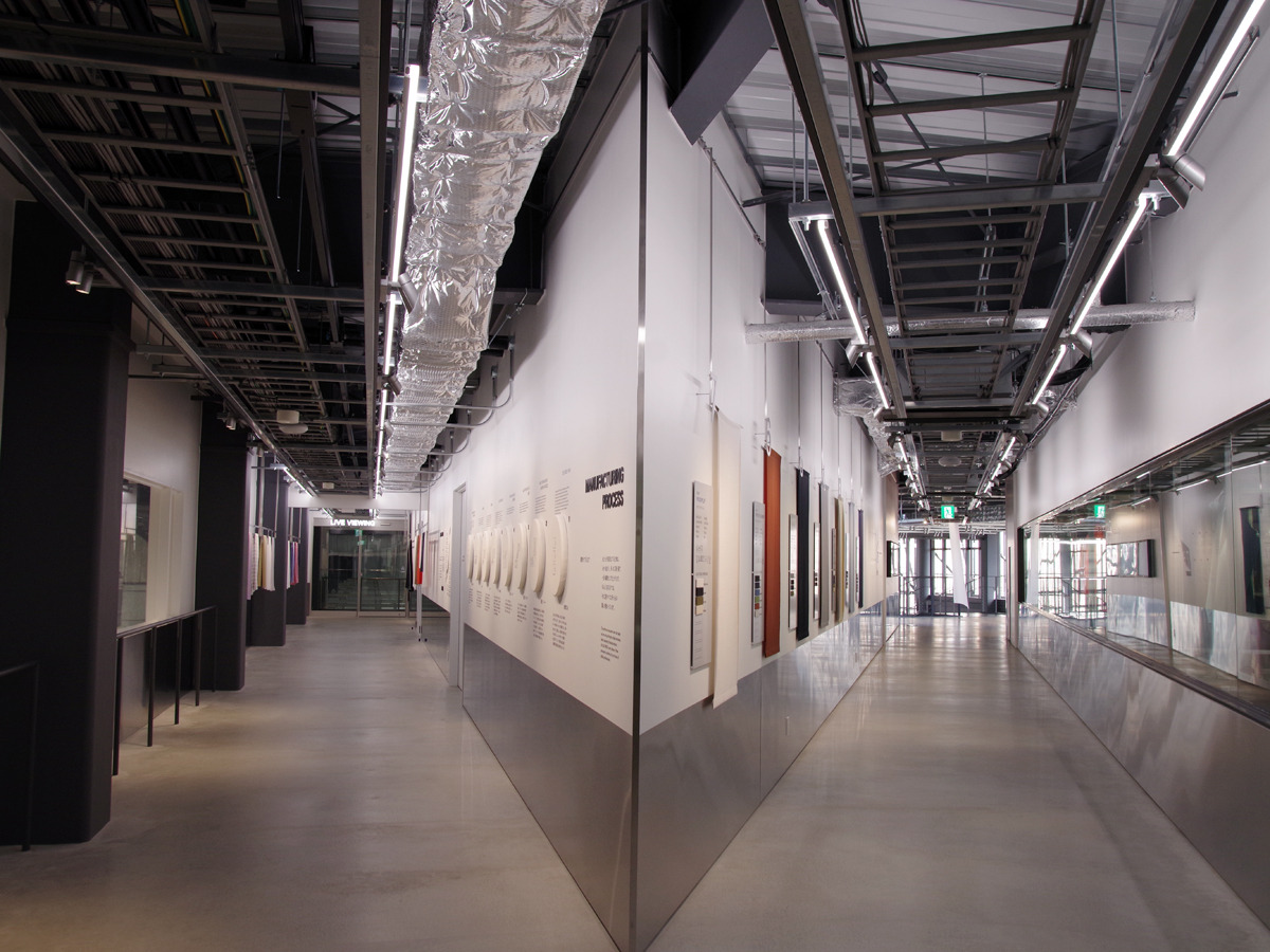 最後の扉を抜けると、ガシャガシャという規則正しい音とともに、実際に稼働している工場の上に出ます。織機が整然と並び、一律のリズムで動いているのを眺めているだけで、時間を忘れて見入ってしまう空間。どこまで続くのだろうと思うくらい広い工場で、約160台もの織機があるとのことです。どこを切り取っても、工場の概念を覆す美しい空間。ものづくりの熱気と、アーティスティックなデザインが見事に調和しています。