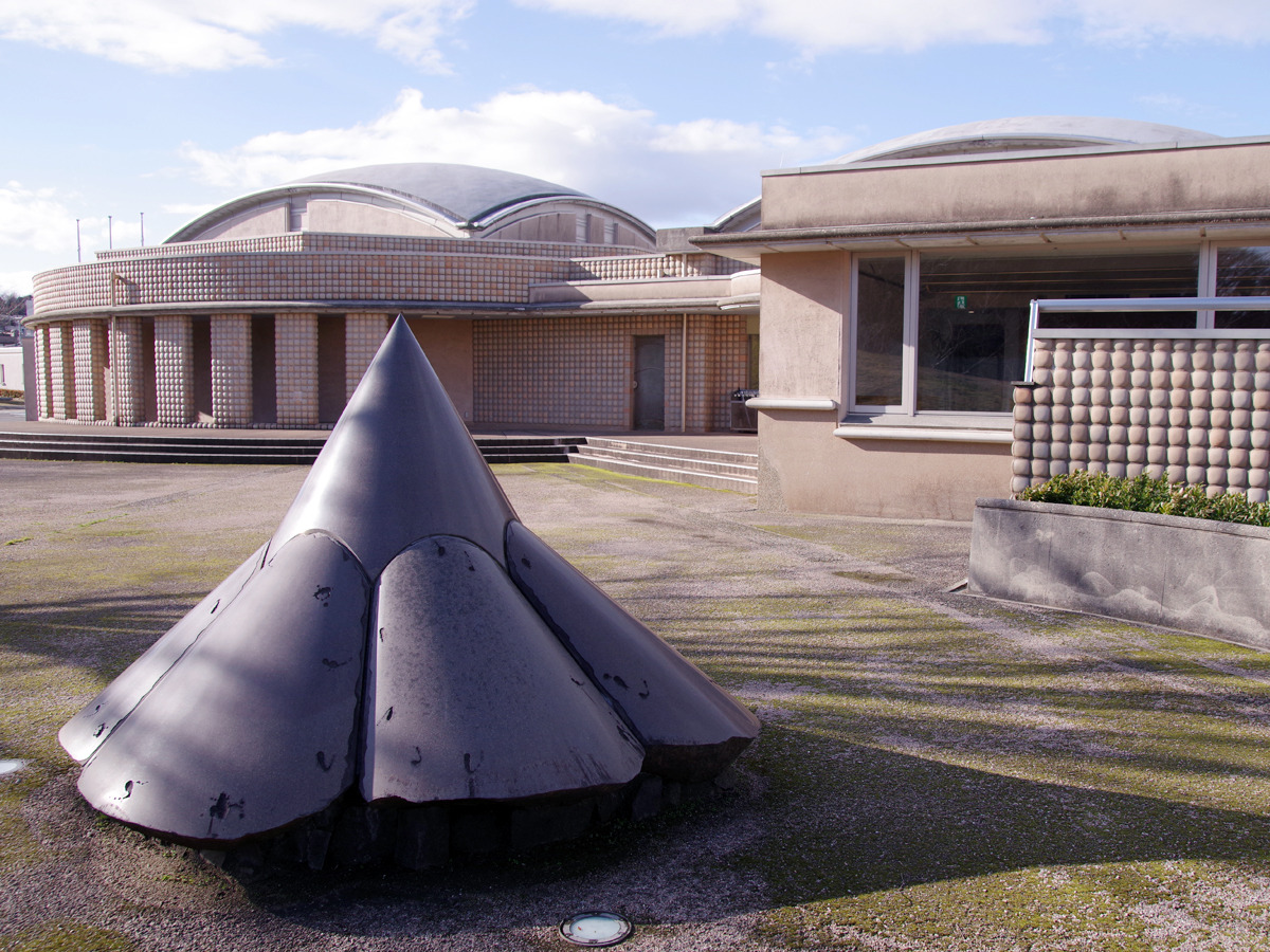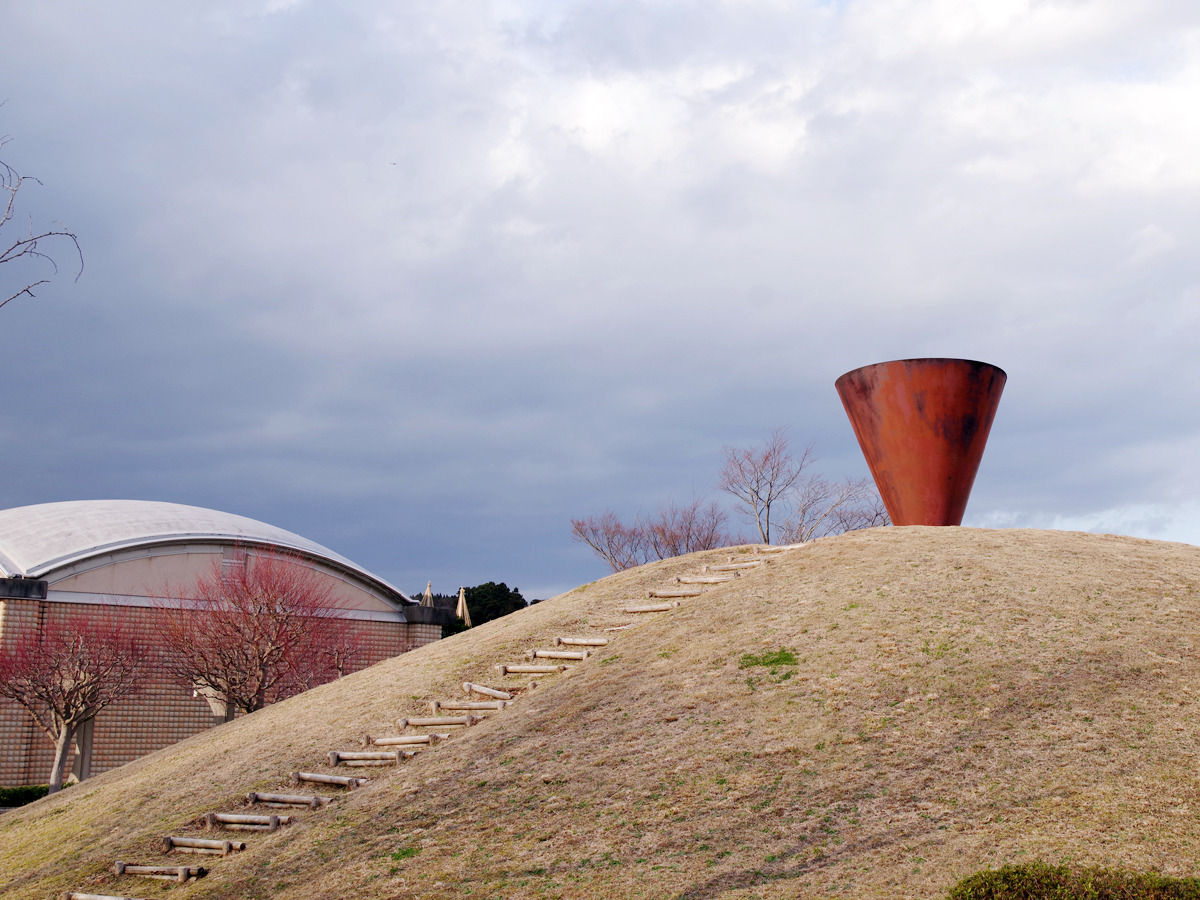 美術館の入口や芝生広場にある小山の上には、見ごたえのあるアート作品が点在しています。光を浴びて輝く鉄のオブジェは、七尾市出身の吉田隆氏の作品「アルパ 97’」。吉田氏は、竪琴(たてごと)をモチーフとした作品を多く手がける彫刻家です。呼応するように設置された円錐形のモニュメントにも、思わず目が留まります。どれも円と直線の組み合わせで、知らず知らずのうちに癒しを与えてくれます。