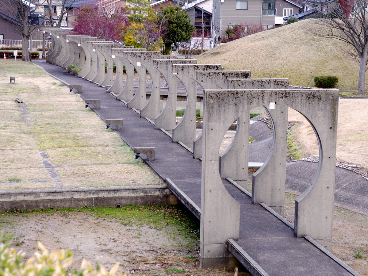 屋外展示場と芝生広場の間には、池とそこにかかる橋があります。この橋にも円をモチーフにした装飾が施され、ひとつの大きなアートになっています。現在は水が抜かれ、復旧まではもう少し時間がかかりそうですが、上から眺めたり遊歩道を回ったりすると、小山の裏手から園路の入口へ出ることができます。大きな円の前は、フォトスポットとしてもおすすめです。