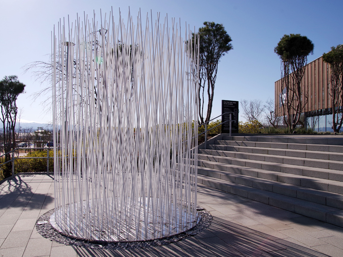 「航空機や宇宙スペースシャトルに使用されている炭素繊維複合材料(CFRP)を極細化し、社員数と同じ331本配置してパブリックアートを創出。1本ずつ慎重にデザインされた方向に5度ずつ傾けることで個性的なモアレ現象の幻を現出させ、「原糸」の抽象化を意図しています。」(奈良祐希氏のInstagramより)