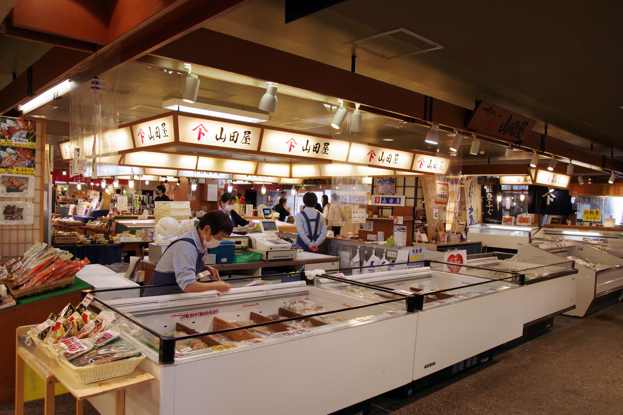 感性を満たした後は、お土産を買いに立ち寄りたい場所があります。美術館から車ですぐの「道の駅 能登食祭市場」は、地元の人も訪れるお土産や海産物の宝庫です。旬の時期には色鮮やかなカニや牡蠣、地元の鮮魚が並ぶ市場です。活気ある雰囲気は、静かな建築巡りとはまた違った楽しさ。新鮮な海産物や能登の銘菓、お酒、工芸品などを買って、ぜひ自宅でも旅の続きを味わってください。