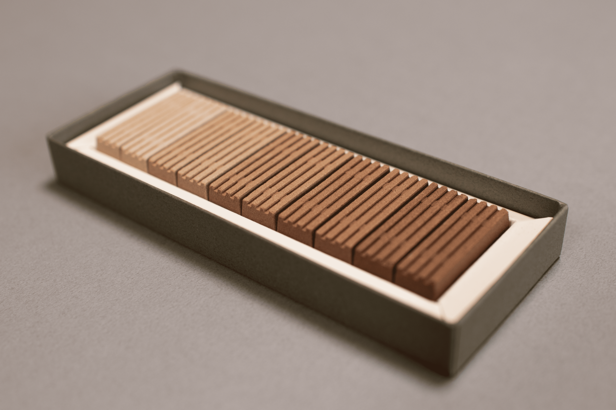 さらに、ブラウンのグラデーションが現代的な美を感じさせる「金沢情菓 茶のしらべ」も注目の落雁。金沢で親しまれている加賀棒茶を用い、配合の違いによる味わいの変化を18%、36%、54%、72%、90%の5段階で楽しめるそうです。食べ比べて、お気に入りを見つけてみては。