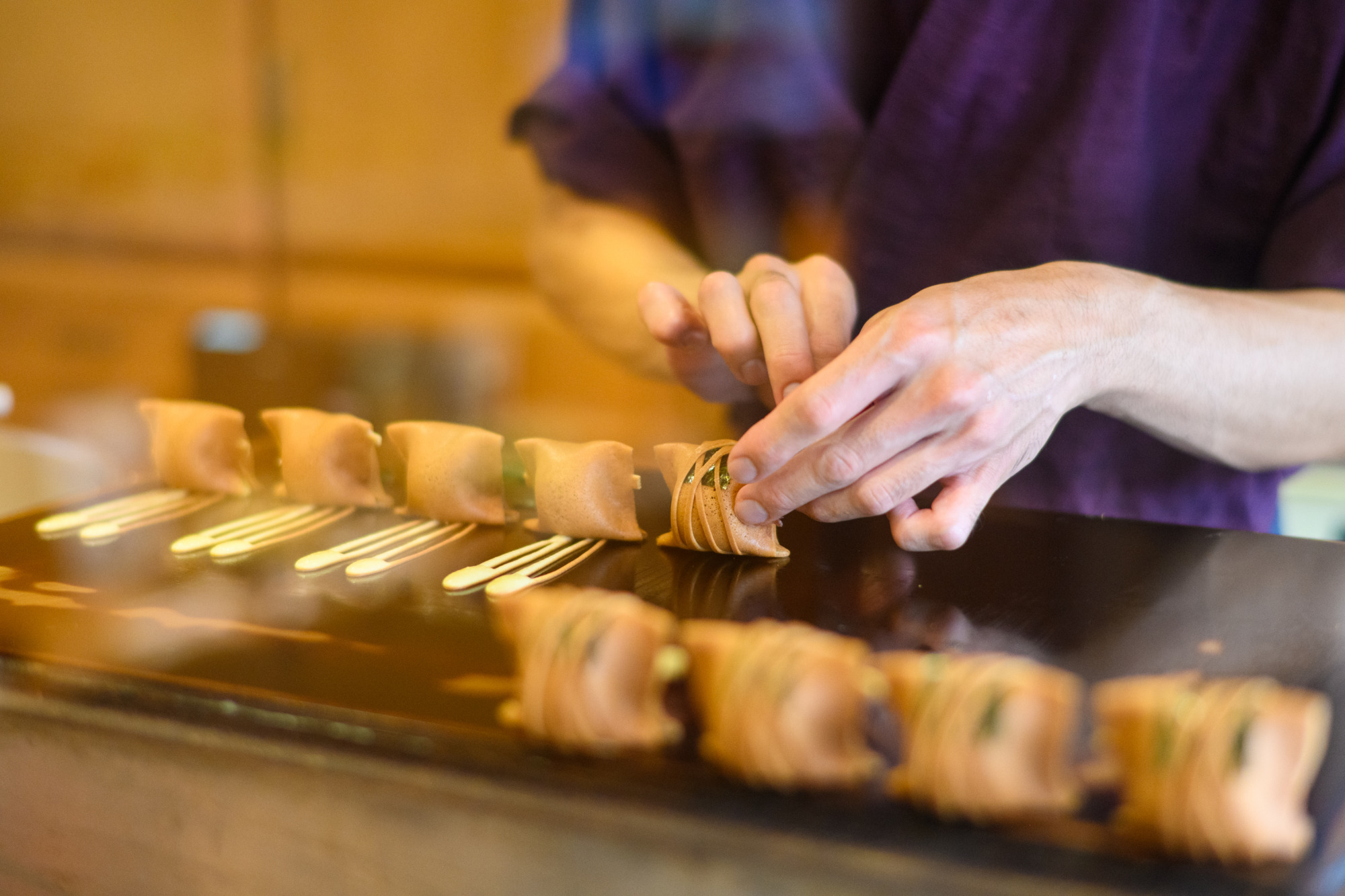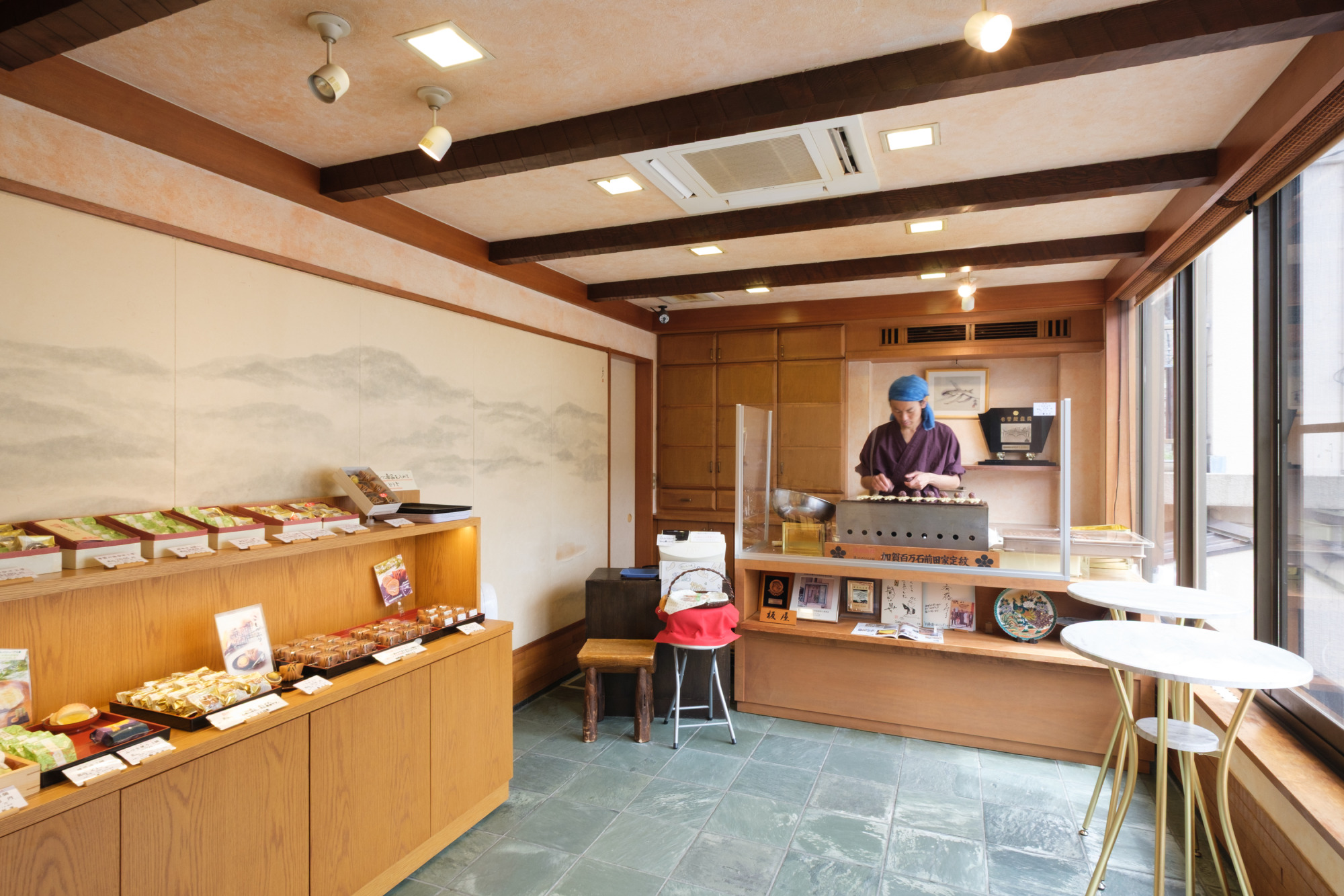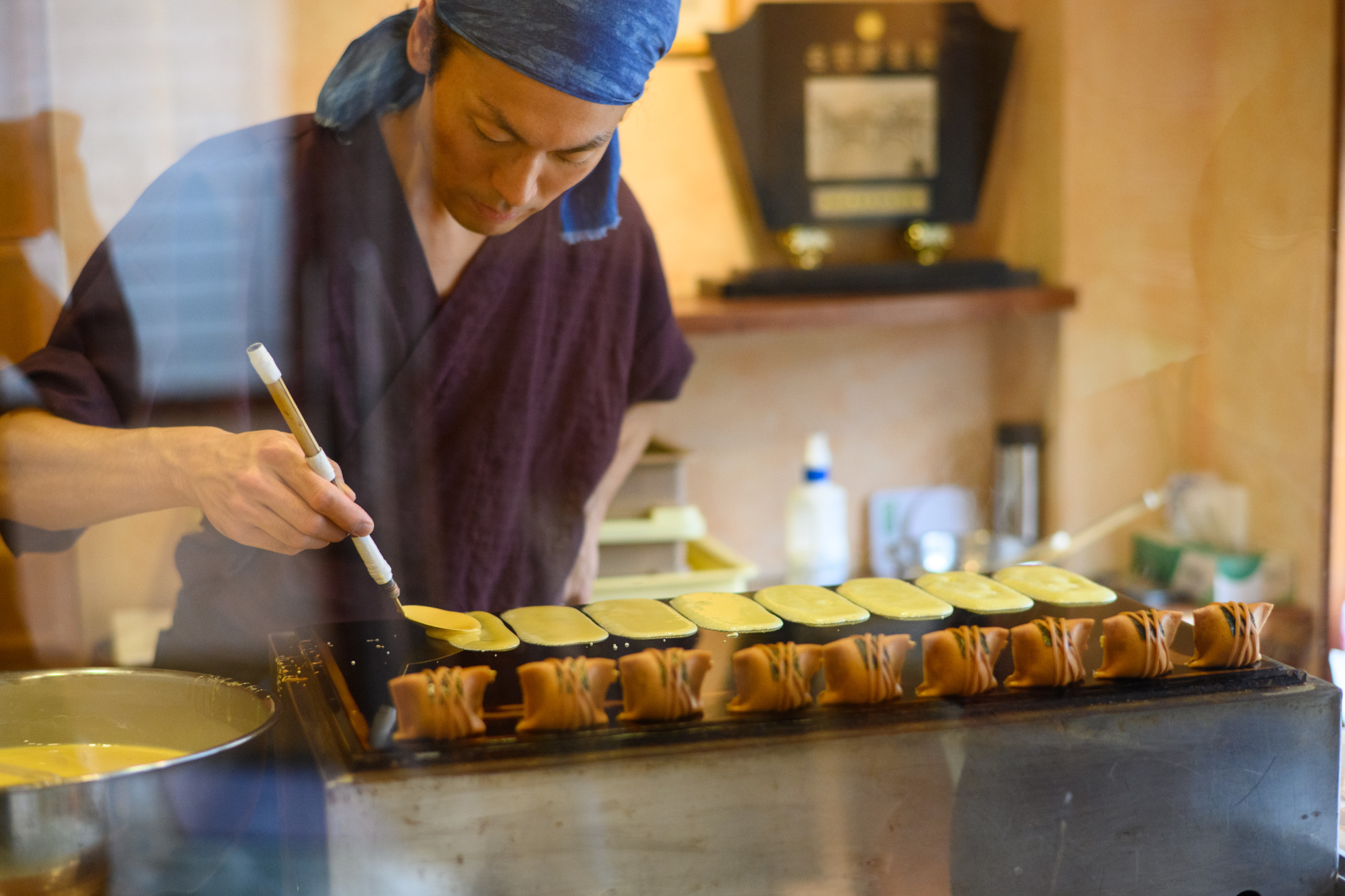 金沢の尾山神社のそばに店を構える、1946年創業の「金沢の味 風土菓 板屋」。人気和菓子の一つが銘菓「こもかぶり」です。お土産にもおすすめですが、店内では焼き上げる様子を見られるため、出来たて・焼きたてをその場で味わえるのも魅力。