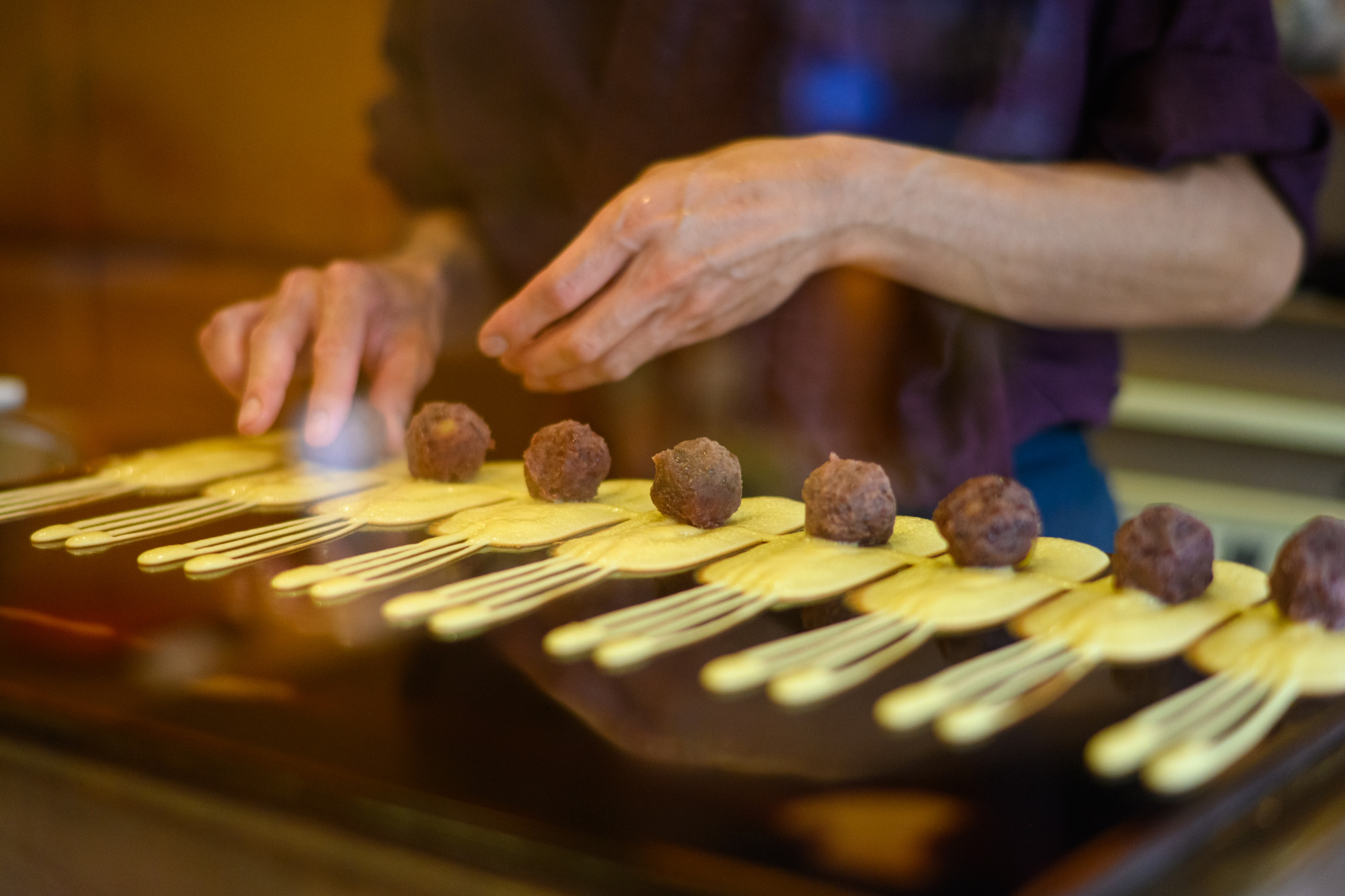金沢に古くから伝わる、屋敷の土壁を雪から守る風物詩「こも掛け(菰掛け)」を表現した和菓子で、中には大粒の栗が丸ごと入っています。職人の手仕事を眺めて、焼きたてを味わい、気に入ったらお土産に。楽しみが重なる一軒です。