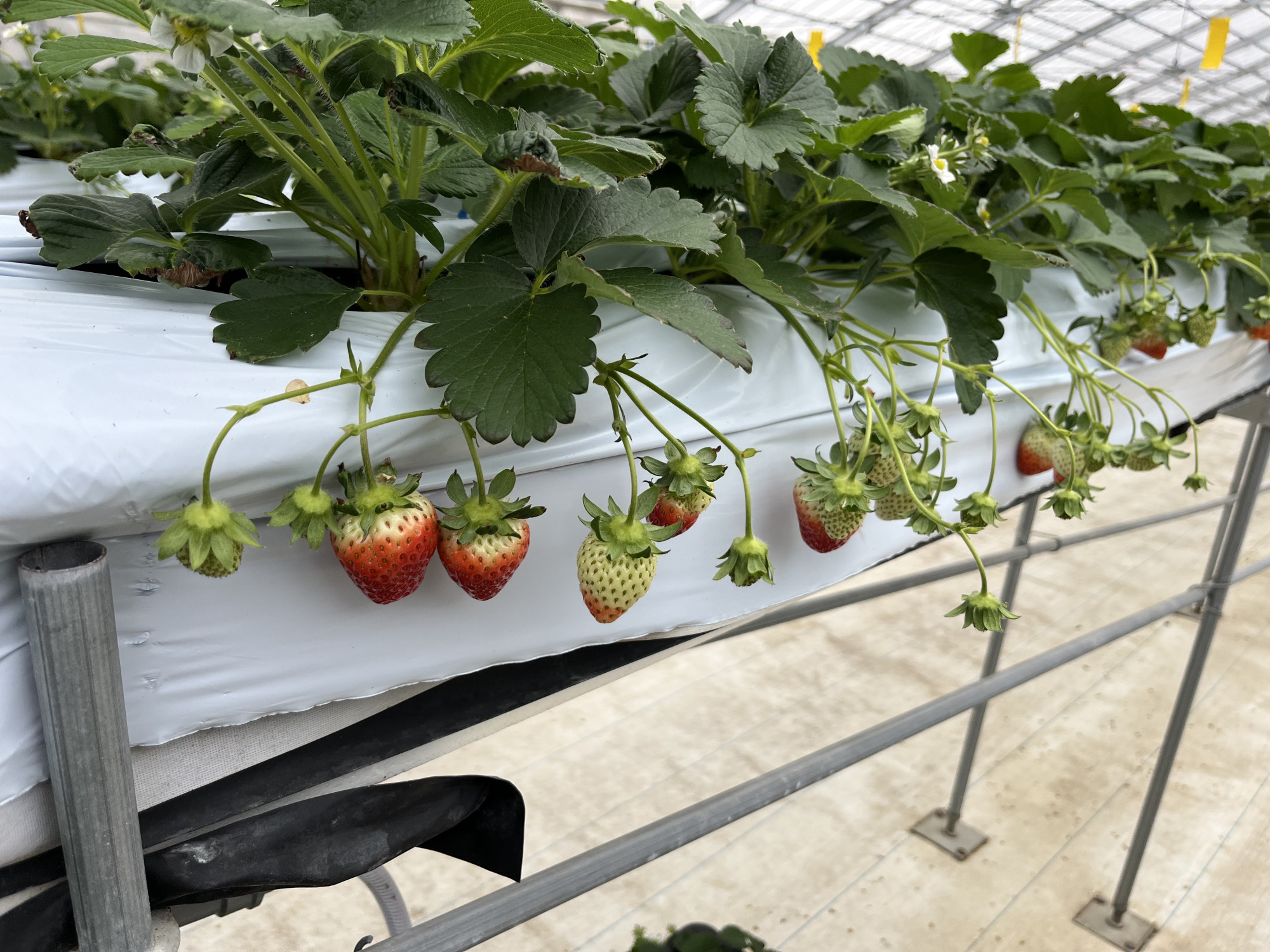 続いて車で6分ほどの場所にある「トレジャーふぁーむ」へ移動。ここでは、いちご狩りやトマトの収穫体験が可能です。こちらでは、とちおとめやよつぼし、すずといった品種が30分間食べ放題で楽しめます。清潔に管理されたハウス内には、赤くてかわいいいちごがたくさん。