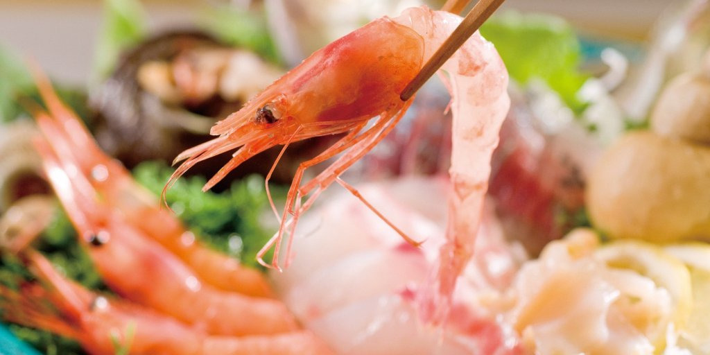 - とろけるような甘さとプリッとした食感が魅力の甘エビ。特に卵を抱えたメスはとても美味しく、珍重されています。お刺身だけではなく、焼いたり、揚げたり、とさまざまな食べ方が楽しめます。(旬:秋~冬)