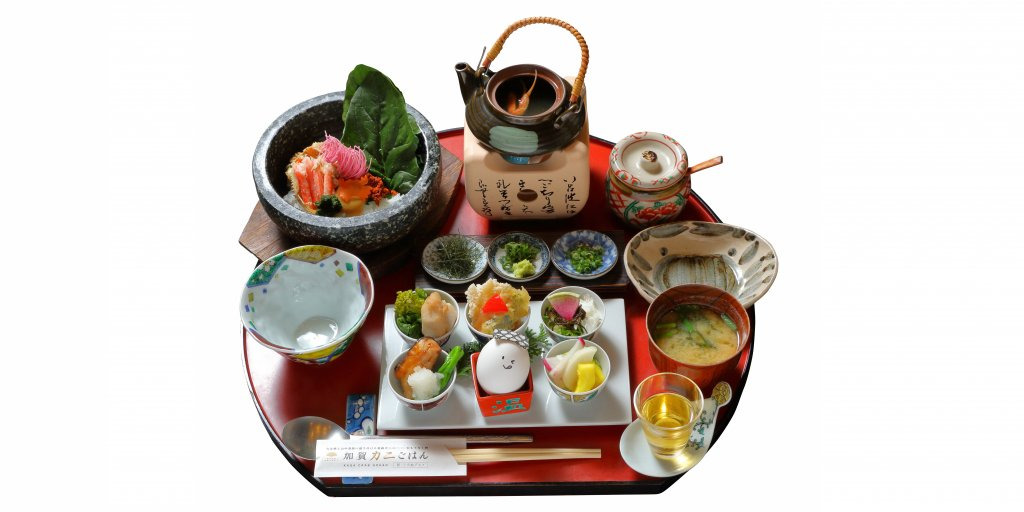 加賀市橋立漁港で水揚げされた「香箱ガニ」一杯を使った「カニごはん」に、旬の野菜や魚を使った小鉢五品、味噌汁、献上加賀棒茶、デザート&コーヒーが付いた「加賀カニごはん」。器には山中漆器と九谷焼を使用し、見た目も楽しめる贅沢なおもてなし料理です。