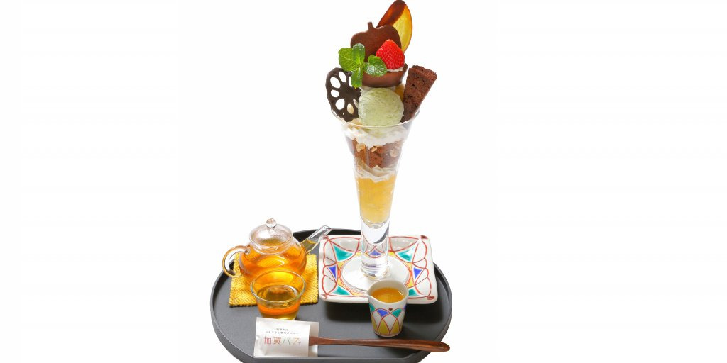 加賀市がおもてなし喫茶メニューとして地産池消をコンセプトに開発した「加賀パフェ」。加賀ならではの素材を5層に盛り付け、その上に「加賀九谷野菜」をトッピング。名物菓子「吸坂飴」オリジナルソース等を使ったこだわりのパフェは美味!さらに味わい深い献上加賀棒茶をセット。地元作家による山中漆器と九谷焼を使用した“おもてなしの心”が詰まったご当地スイーツです。