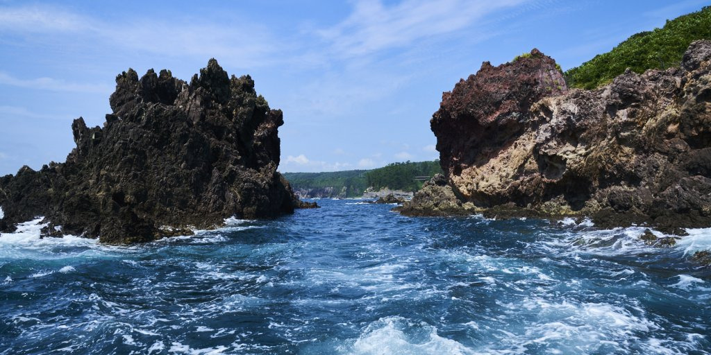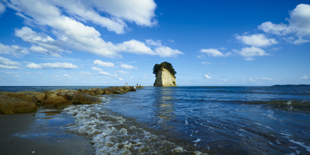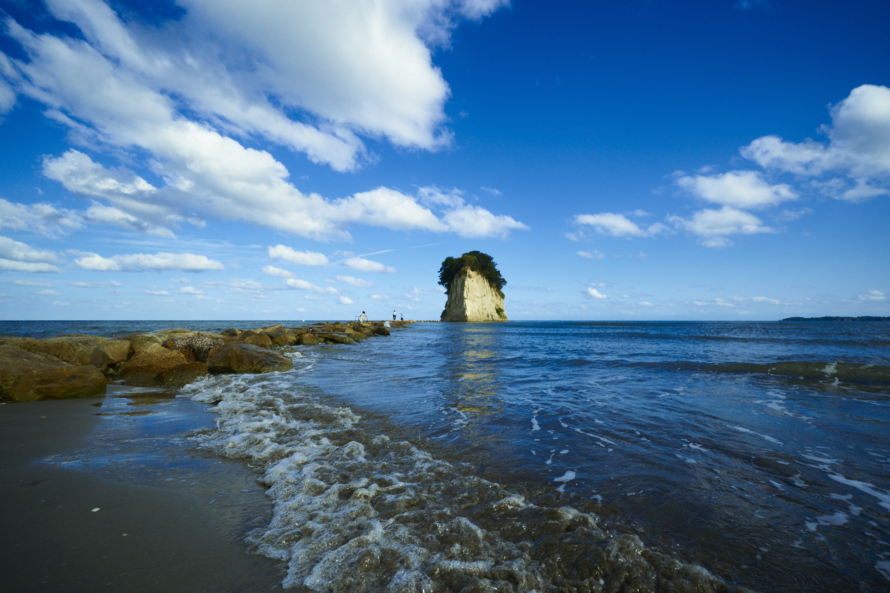 高さ28mの大きな岩がそびえ立ち、その独特の見た目から別名「軍艦島」とも呼ばれています。踏み石が並べられているため、引き潮の時間帯には島の近くまで歩いていくことができます。