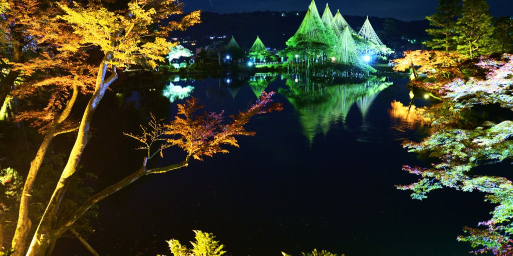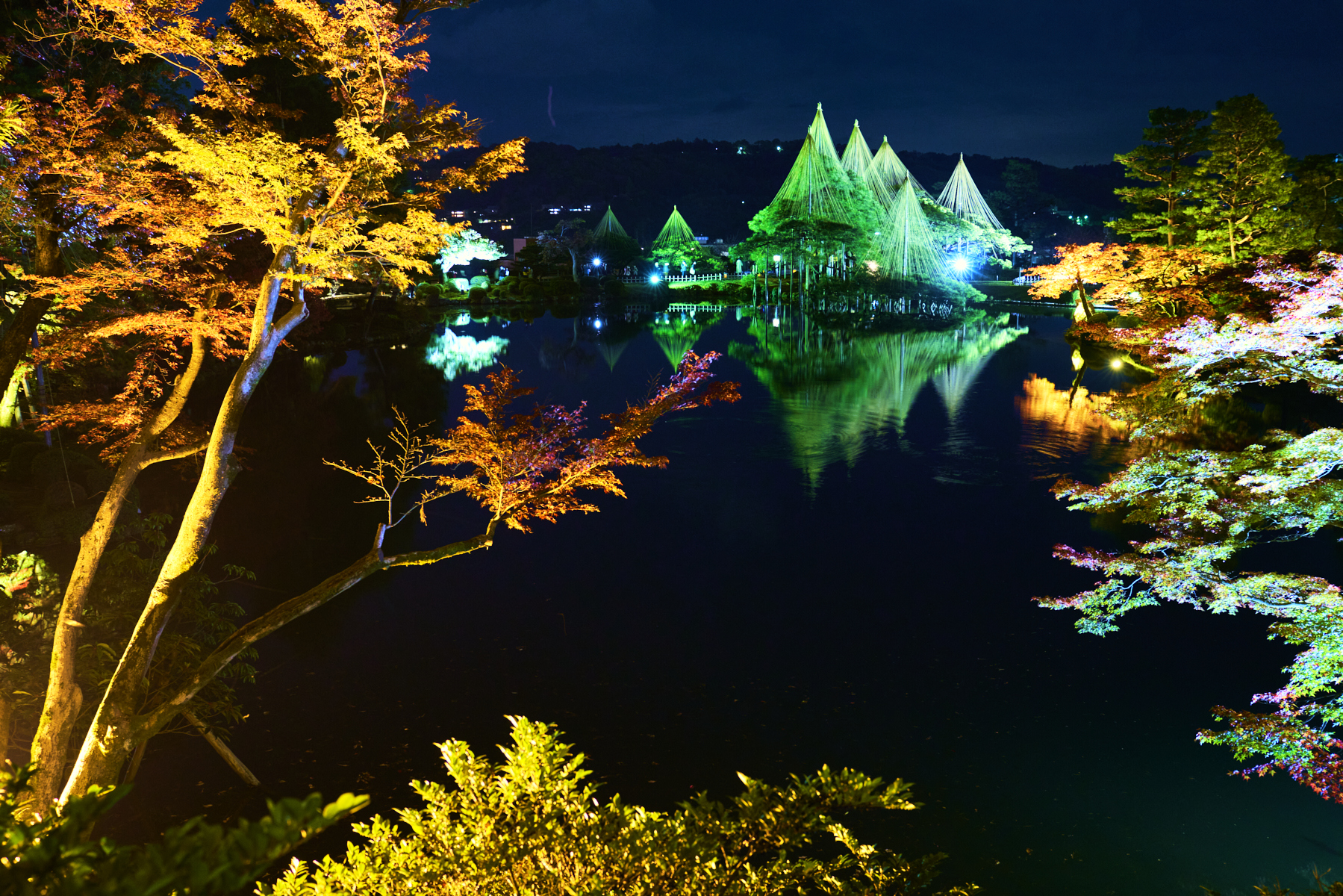 兼六園には、約300本のモミジが植えられており、例年晩秋に赤や黄色に色づき、松の緑と美しいコントラストが楽しめます。この時期だけの風情溢れる夜の風景です。