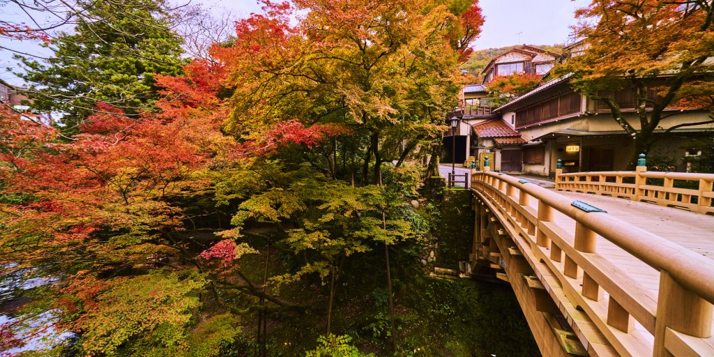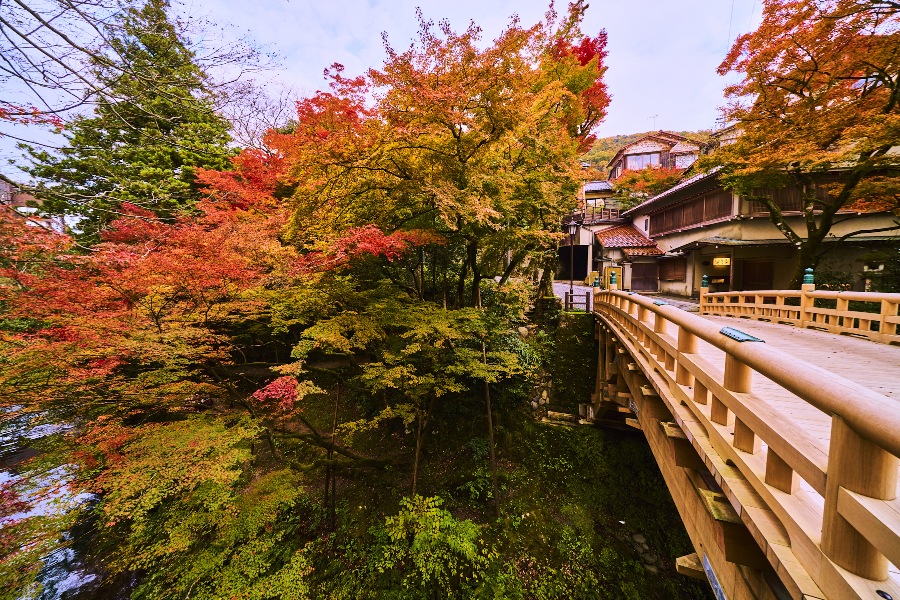 山中の温泉街に沿って流れる大聖寺川の渓谷で、上流の「こおろぎ橋」から「黒谷橋」までの約1キロの区間をさす鶴仙渓。総檜造りの「こおろぎ橋」から見られる紅葉の時期の眺めは格別です。