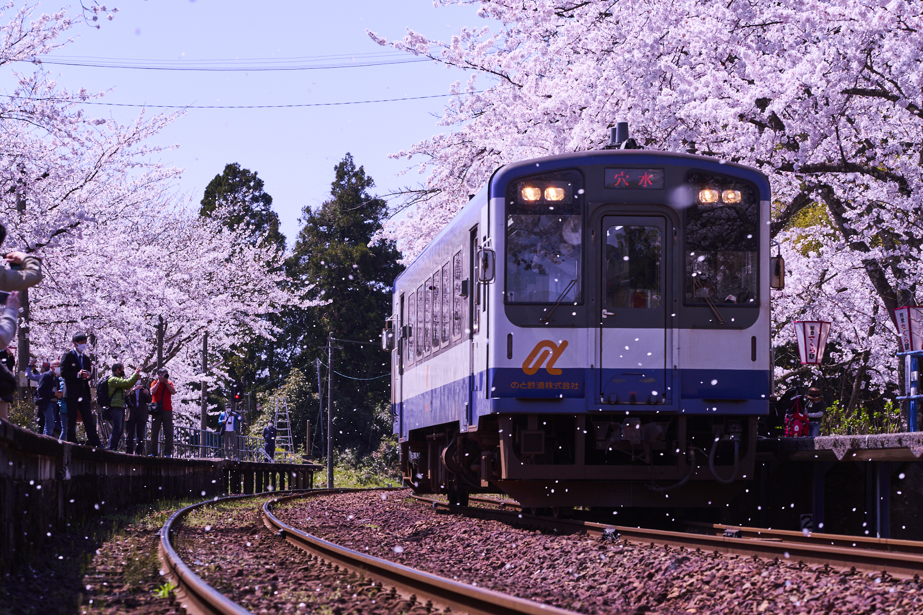 能登鹿島駅は、通称「さくら駅」と呼ばれています。春になると、上下線路を挟んで数十本のソメイヨシノが両ホームから構内を覆うように咲き、見事なサクラの花のトンネルができます。