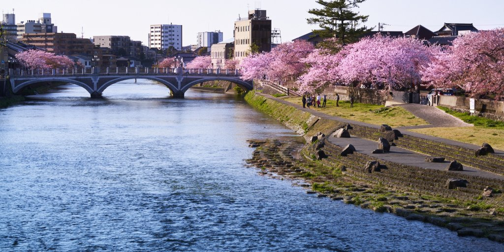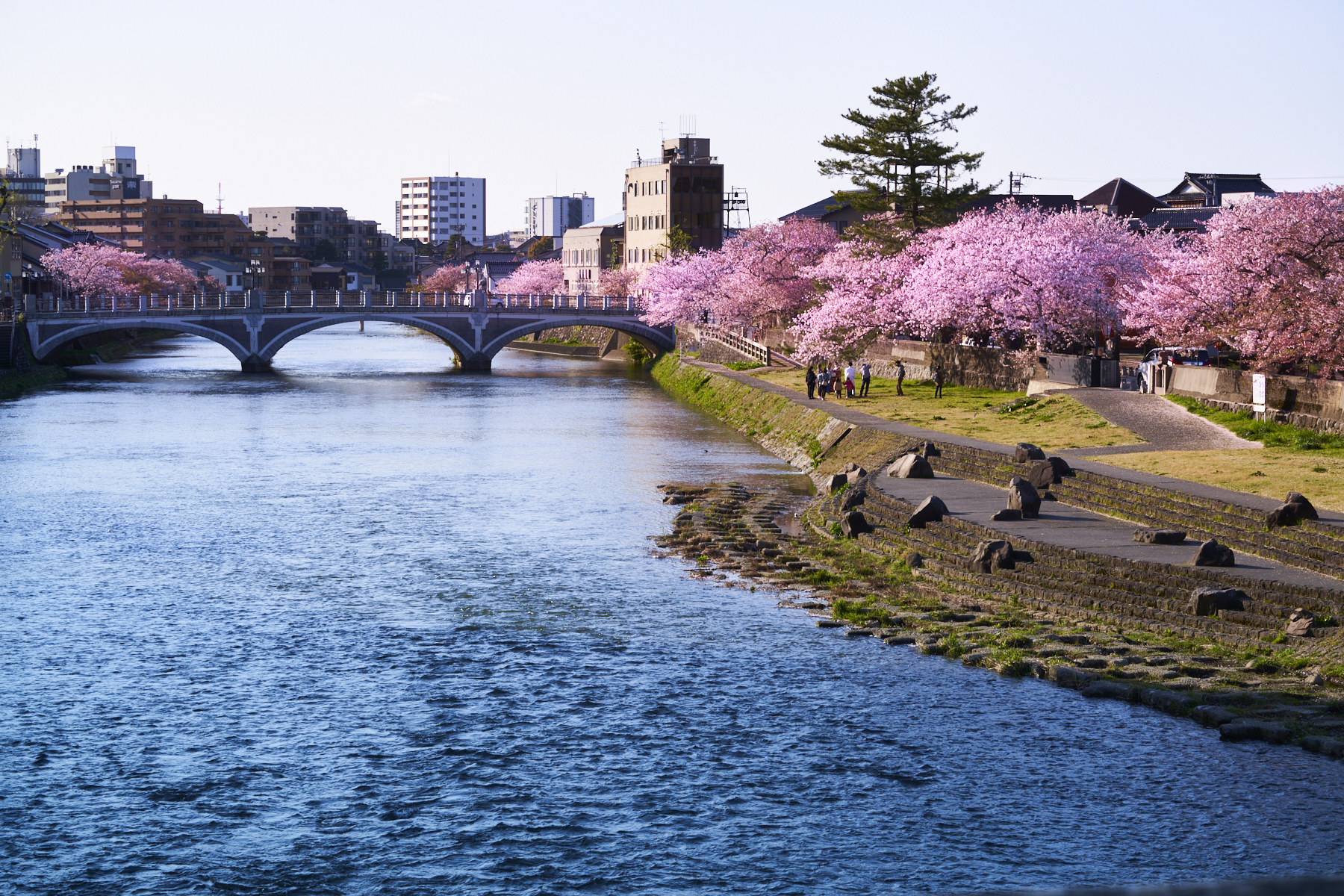 どことなく繊細な情緒のある浅野川は、別名「女川」と呼ばれています。界隈は金沢らしい風情を漂わせており、中の橋と梅ノ橋は泉鏡花の小説の舞台ともなっています。
