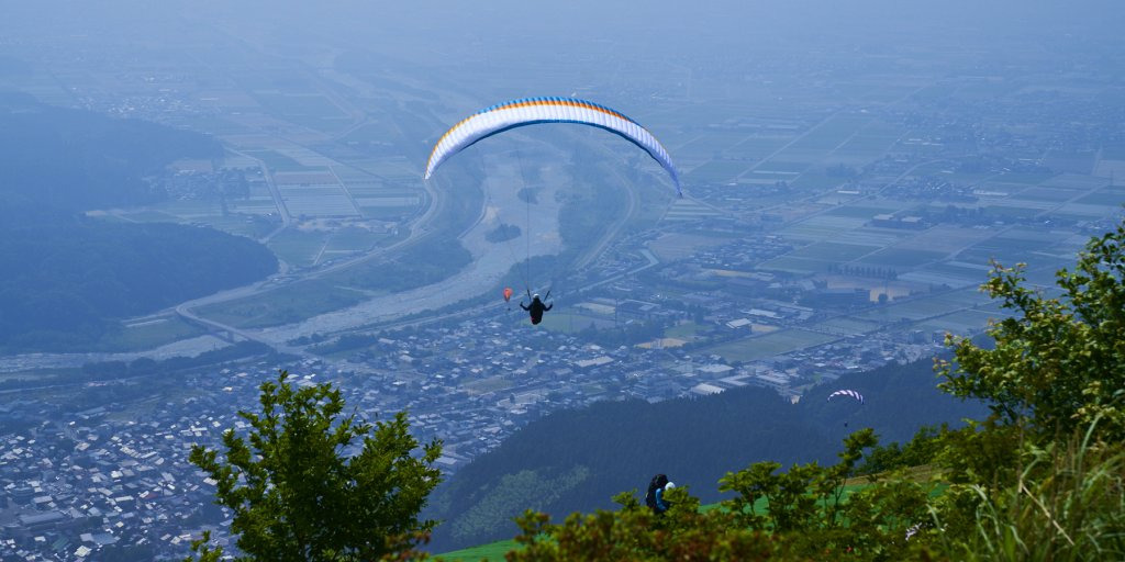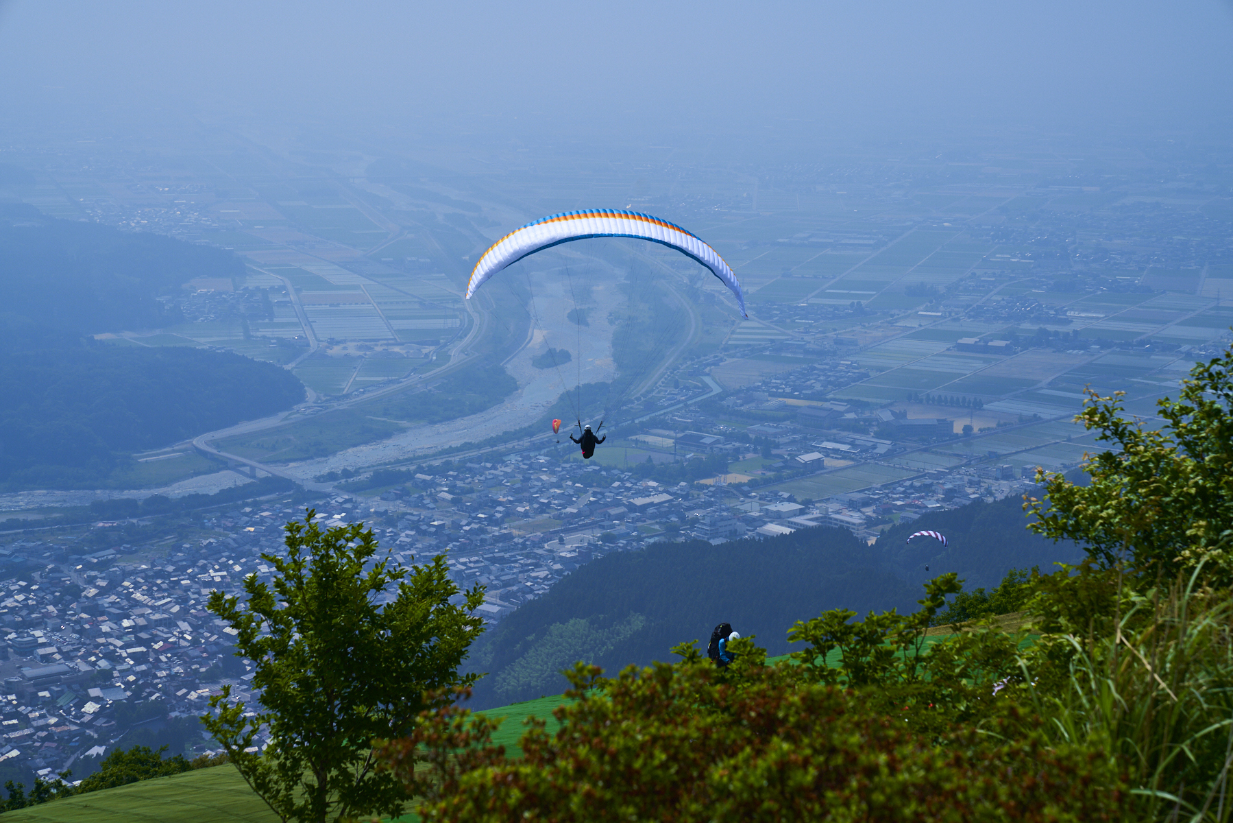広大な加賀平野と手取川の扇状地帯がパノラマのように展開し、アルプス連峰、日本海も望むことができる獅子吼高原。パラグライダーに乗れば、眼下に広がる景色を楽しむことができます。