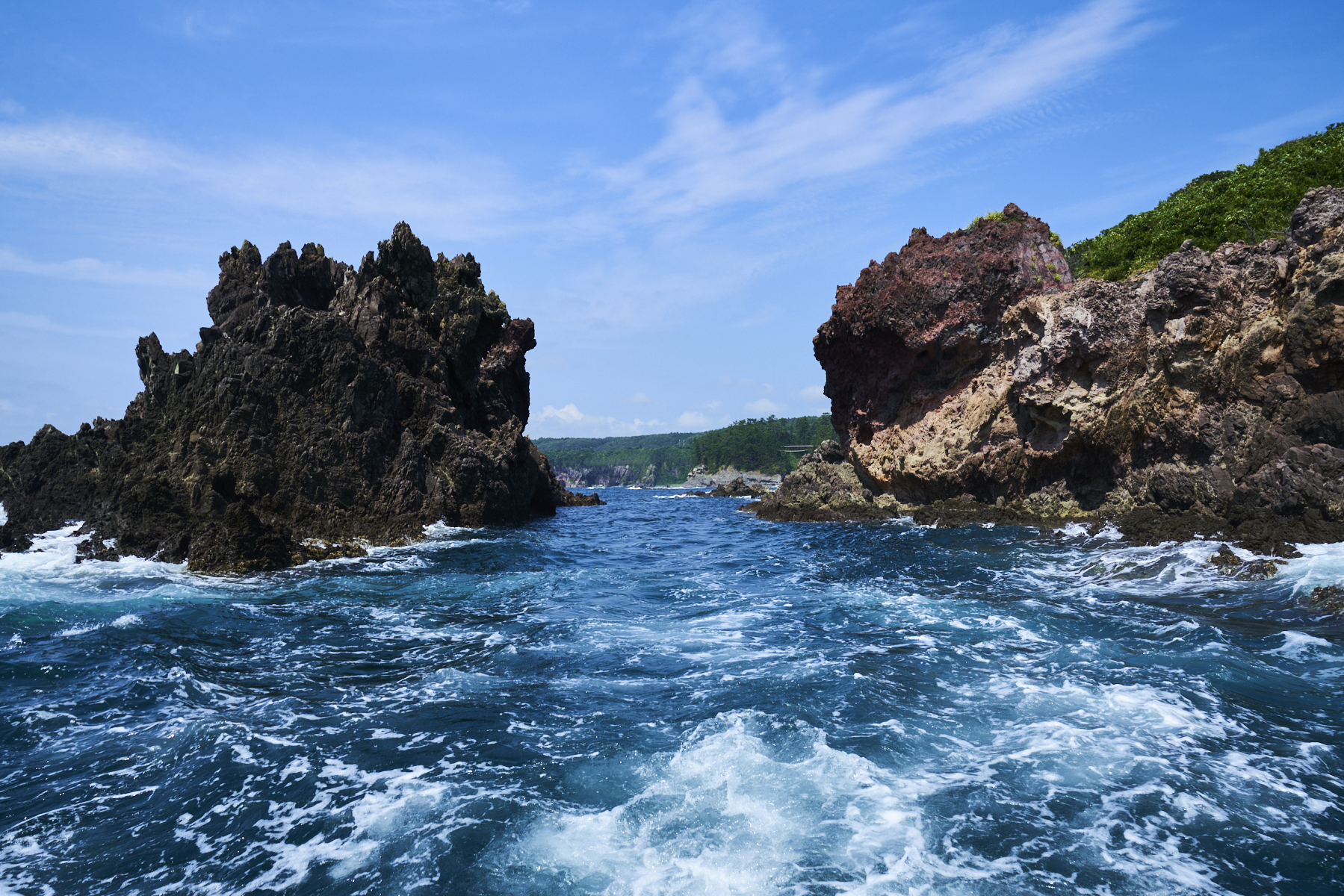 能登金剛を代表する奇岩の名所巌門。海に突き出た岩盤にある、ぽっかりとあいた洞門の上には老松が生い茂っています。遊覧船が出ており、海上から眺める景色はまた違った迫力があります。