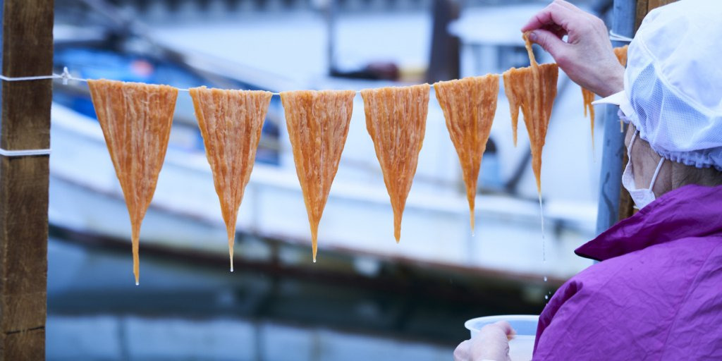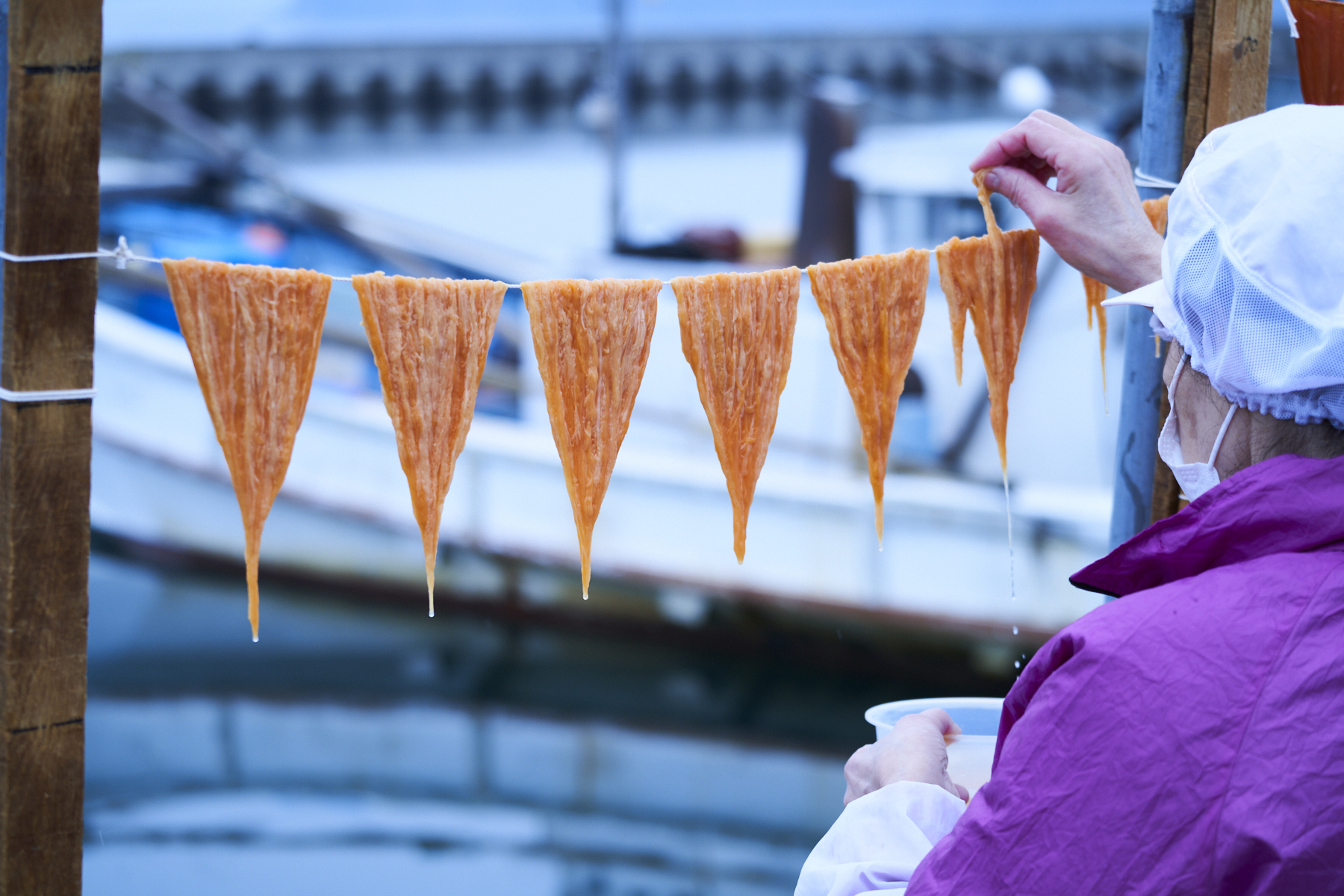 ナマコの卵巣を干して作られる「くちこ」。「海の宝石」とも言われる大変高価な珍味です。三角形状になるように整えられたくちこづくりの風景は、ナマコ漁に合わせて見られる冬の風物詩です。