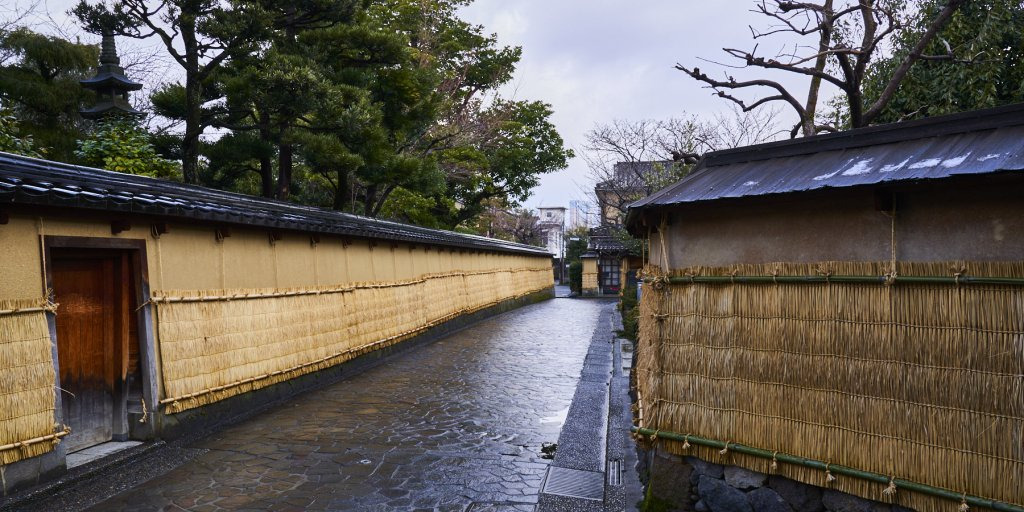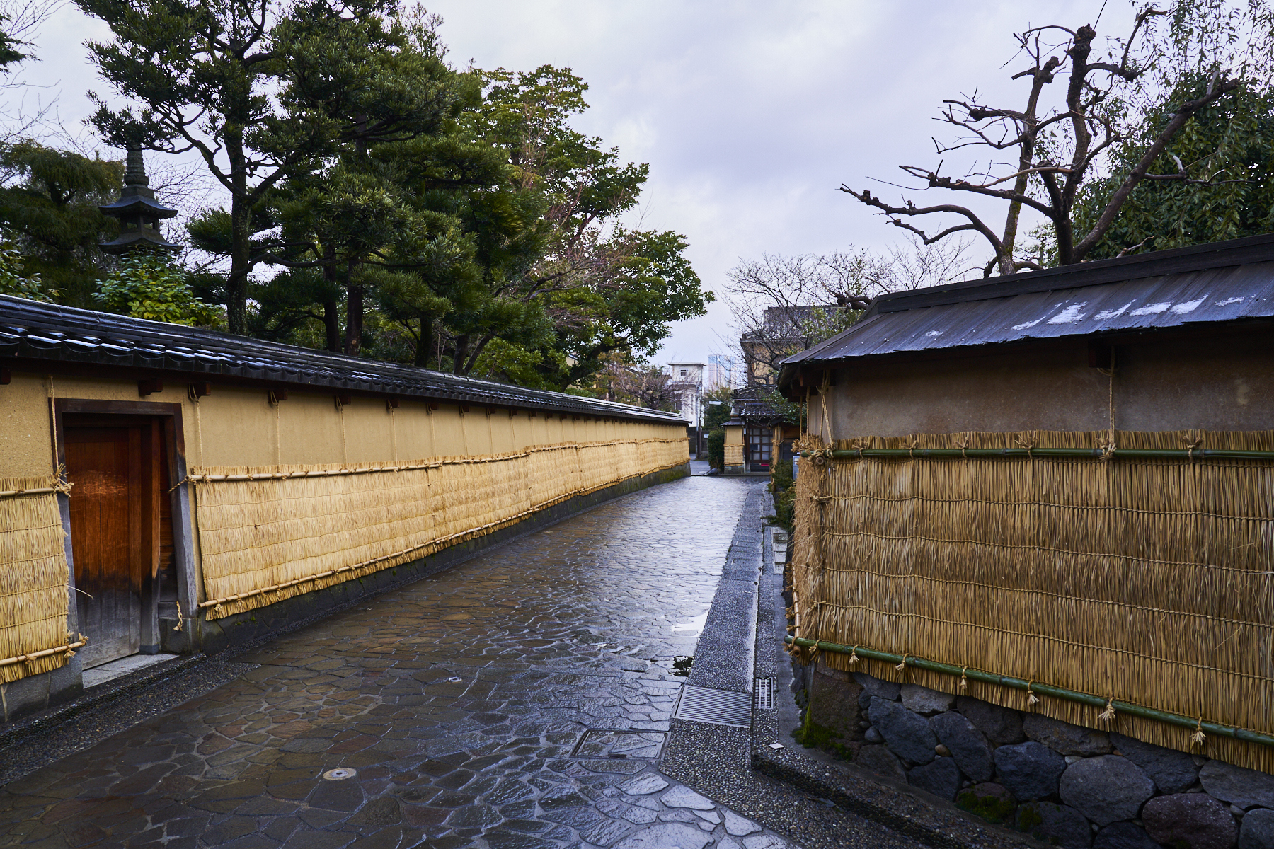 加賀藩士たちが行き交った往時の面影を感じる町並み。冬の雪から土塀を保護する「薦掛け」は金沢の冬の風物詩です。