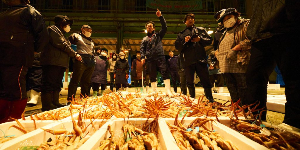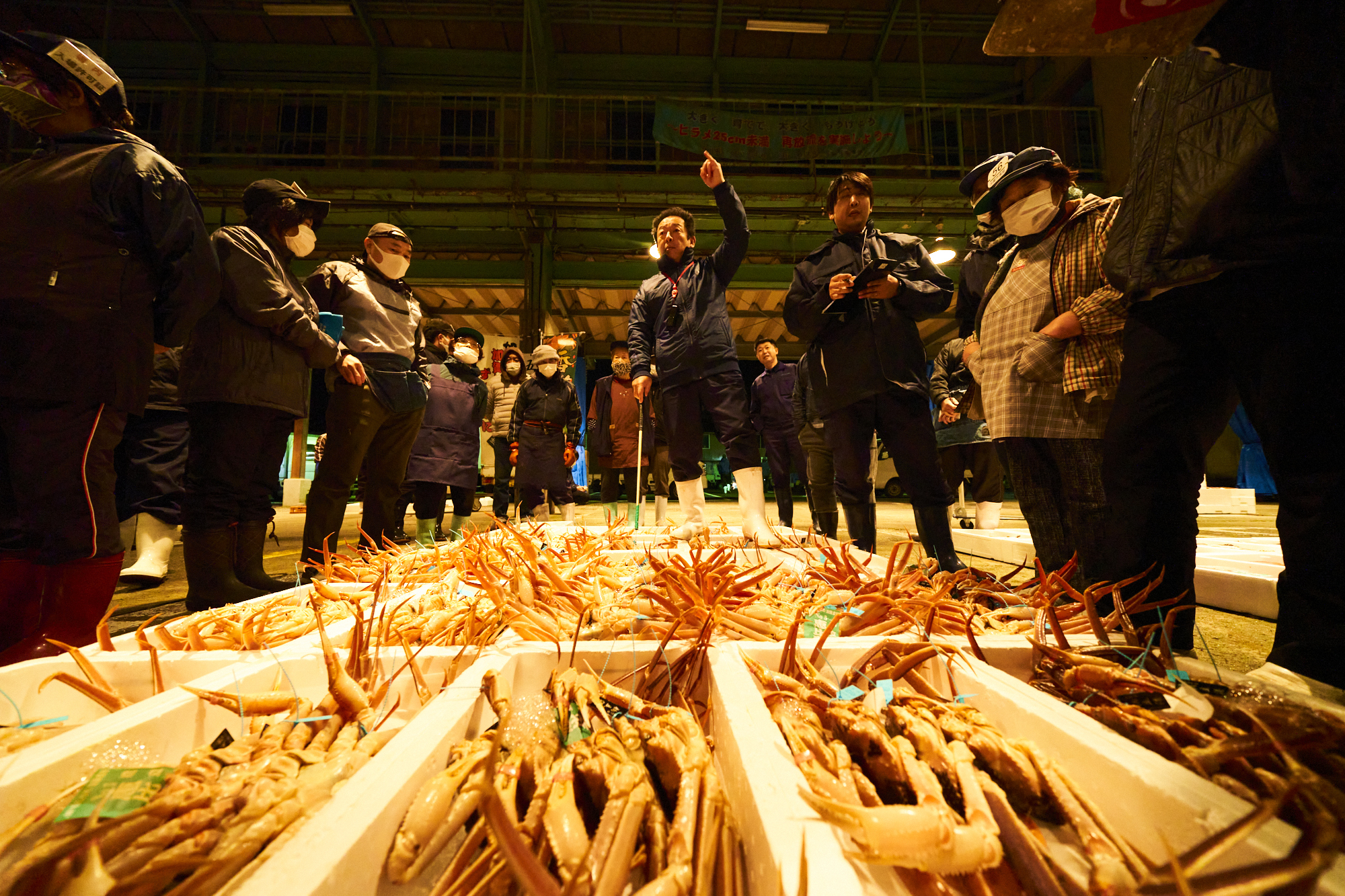 北前船の船主や船頭が多く居住した橋立。橋立漁港では11月にカニ漁が解禁となり、新鮮な加能ガニ(ズワイガニ)が競りにかけられます。競りは早朝ではなく、夕方に行われるというのも特徴の一つです。