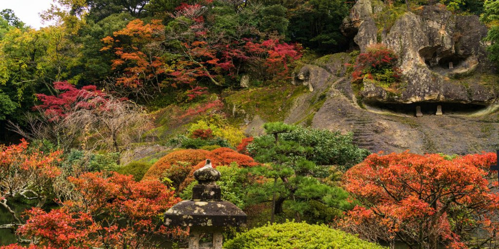白山信仰の寺として、泰澄大師によって創建されたと伝わっています。紅葉の名所としても知られ、赤や黄色に色づく木々に彩られた岩壁が見事な景観を生み出します。