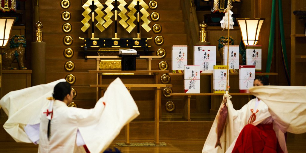 古くは国司も参列した由緒ある祭事で、菅原道真ゆかりの神饌(しんせん)「梅枝餅(うめがえもち)」が供えられ、舞女による「浦安の舞」が奉奏されます。