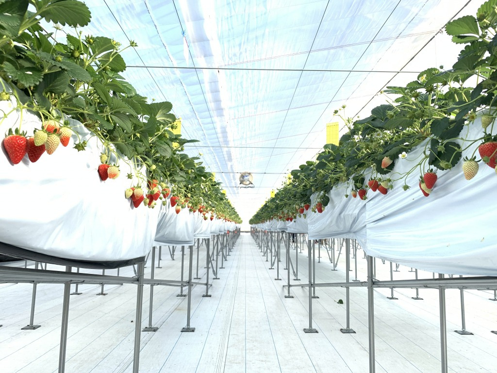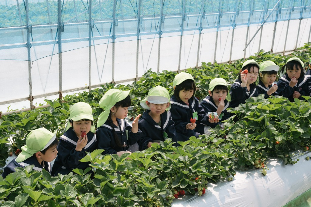 5月中旬に最盛期を迎える赤崎いちご園では真っ赤に完熟したいちごを摘み取りして楽しめます。