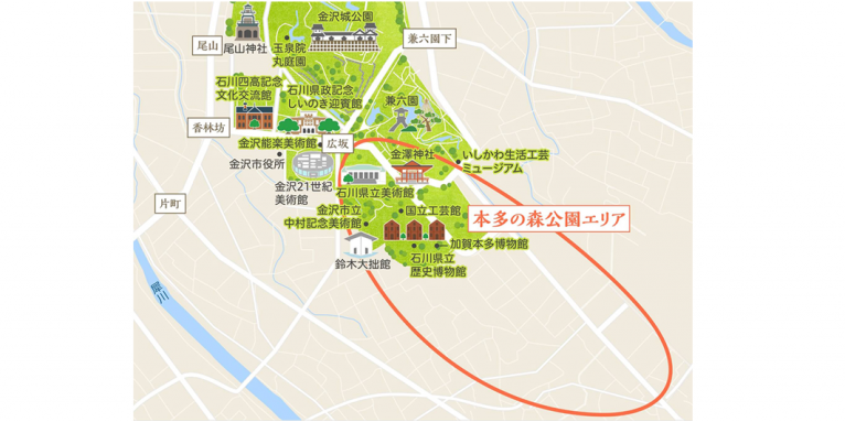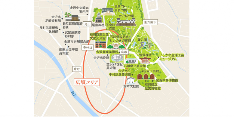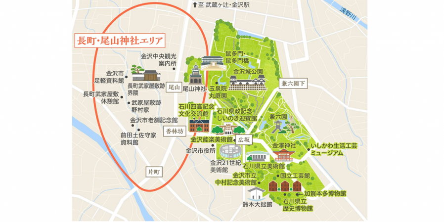 加賀百万石回遊ルート上の施設を含む、金沢市中心部の