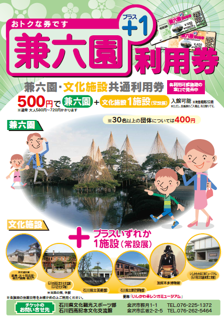 500円で兼六園と文化施設1施設(常設展)に入館できるお得なチケットです。