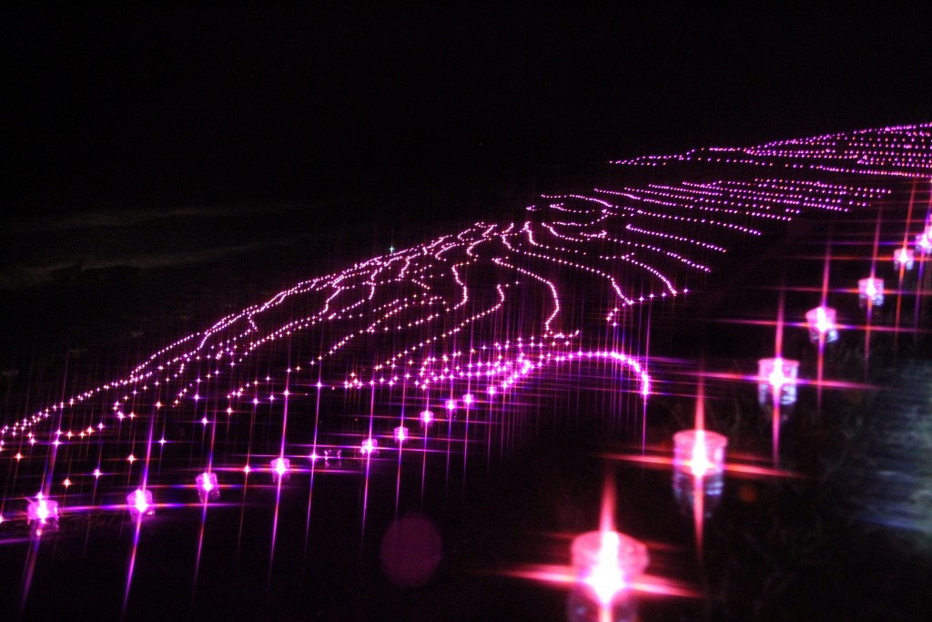 白米千枚田を彩る約25,000個の壮大なイルミネーション、あぜのきらめき。日没後、あたりが暗くなるにつれて点灯してゆく様子はとても幻想的です。