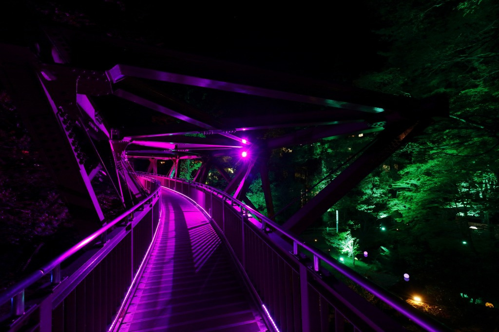 山中温泉の名所「あやとりはし」が九谷五彩をイメージした色合いで幻想的にライトアップされており、SNS映えするスポットです。夜のまち歩きがさらに楽しめます。
