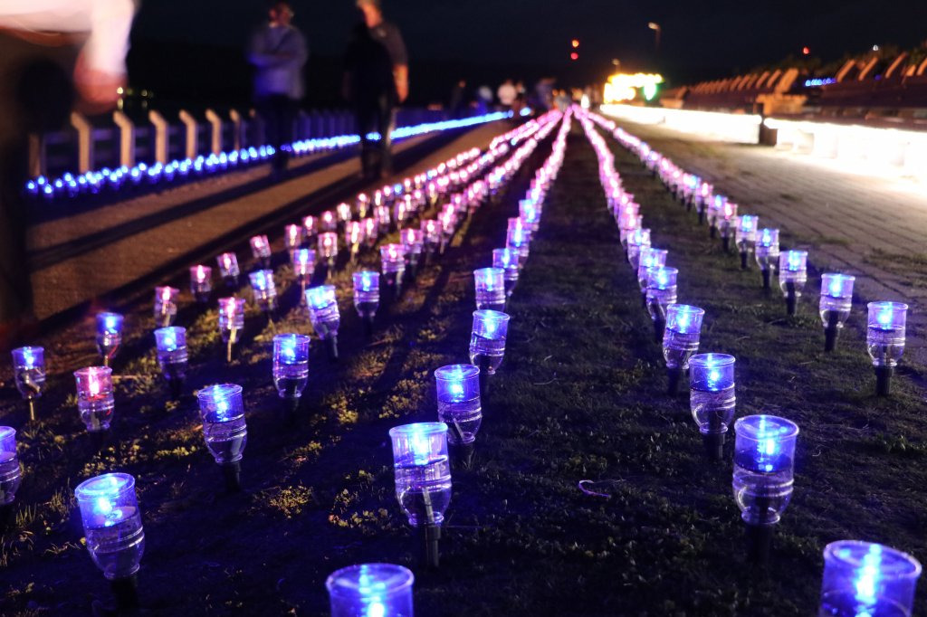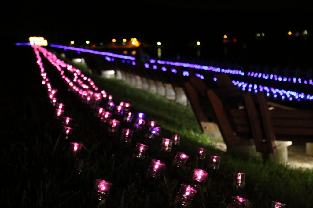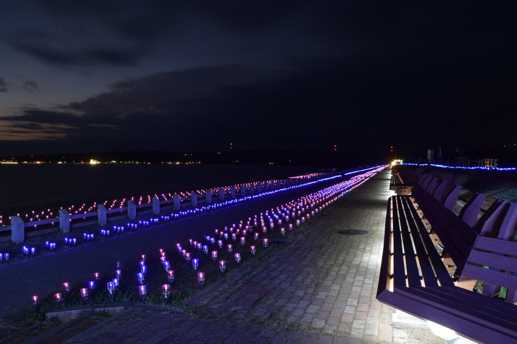 増穂浦海岸にある「世界一長いベンチ」周辺を、LED照明「ペットボタル」の灯りが彩るイルミネーションイベント。増穂浦海岸に打ち寄せられる、幸せを呼ぶ貝「さくら貝」のさくらピンクと、里浜をイメージした里浜ブルーが輝きます。