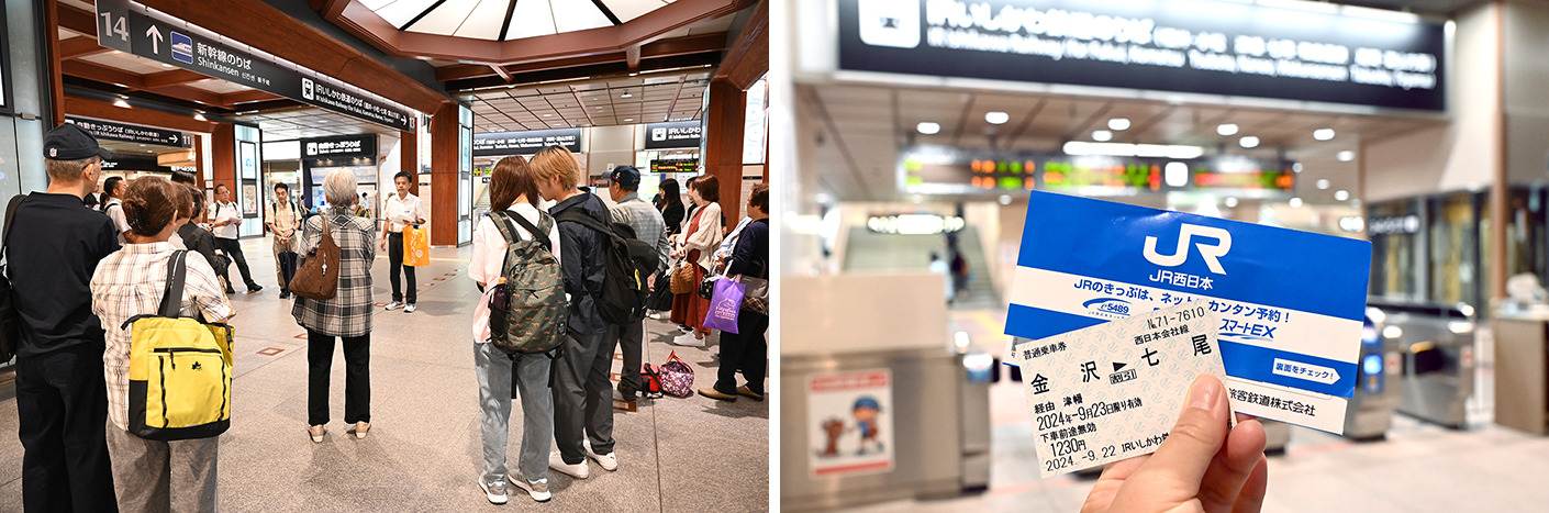 7:10に「金沢駅」の「IRいしかわ鉄道」改札前で、オレンジ色の旗をもった「ほっこく観光」添乗員さんが迎えてくれます。まずここで受付をして切符を受け取ります。