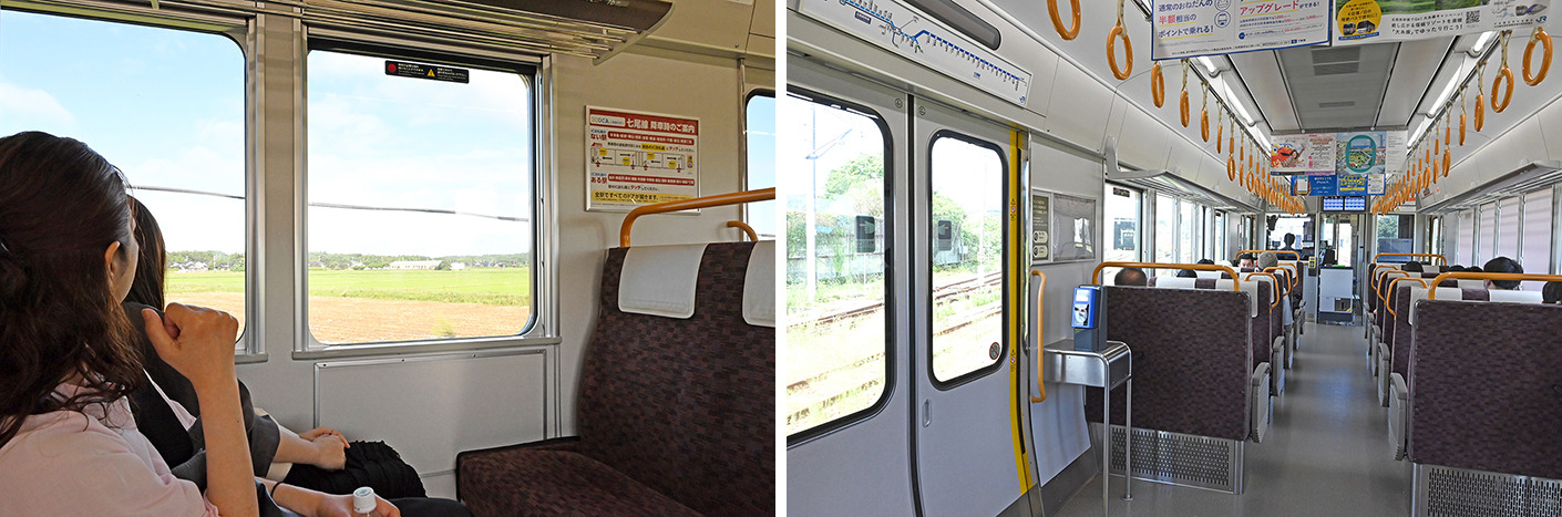7:20に参加者全員が集合し、添乗員さんから説明を聞いてから、改札を通過して列車に乗り込みます。「金沢駅」から「七尾駅」まで「IRいしかわ鉄道」「JR七尾線」を乗り換えなしの1本で行けます。