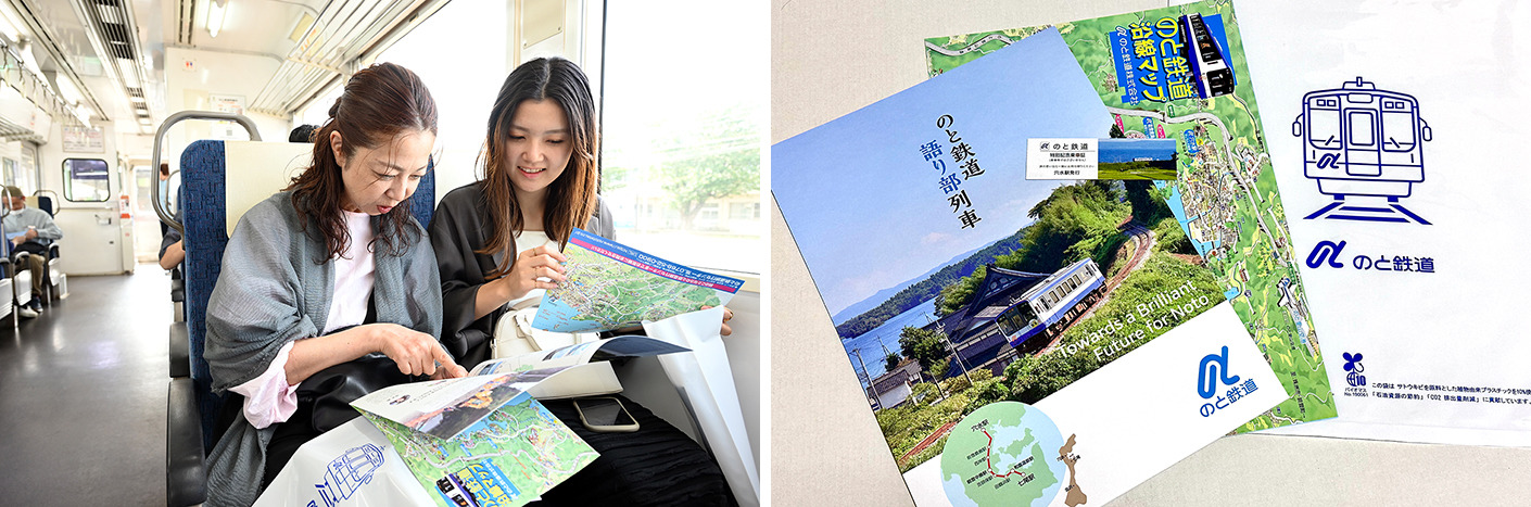 ツアー参加者が乗り込んだのは、2両編成のうち団体の貸切になっていた後方車両。乗車するとパンフレットと沿線マップ、特別記念乗車証が配られました。パンフレットには各地の被災状況、能登の今などが紹介され、3名の語り部さんの震災体験なども掲載されています。