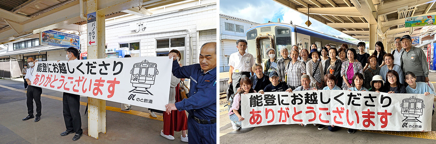 「穴水駅」のスタッフの皆さんが横断幕を持って迎えてくれました。列車を降りてから、語り部の宮下左文さん、坂本藍さん、牛上智子さんと記念撮影。「語り部列車」の旅は、防災の大切さや被災地の現状について、自分ごととして考えるよい機会になりました。